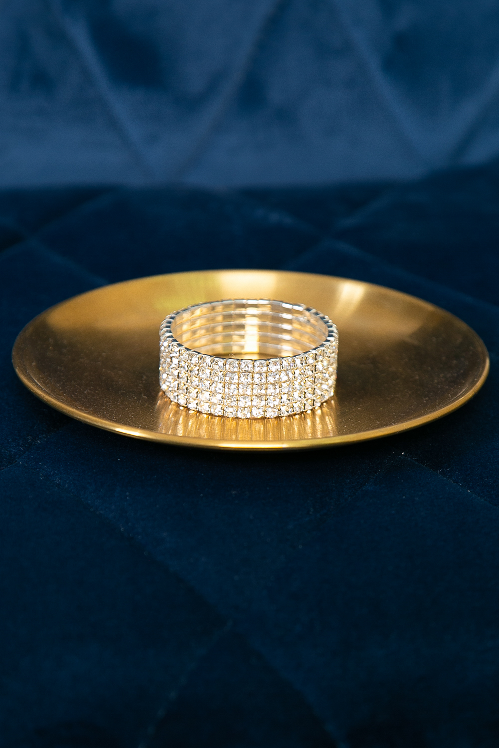 Браслет состоит из пяти рядов сверкающих кристаллов. За счёт своей конструкции хорошо растягивается.