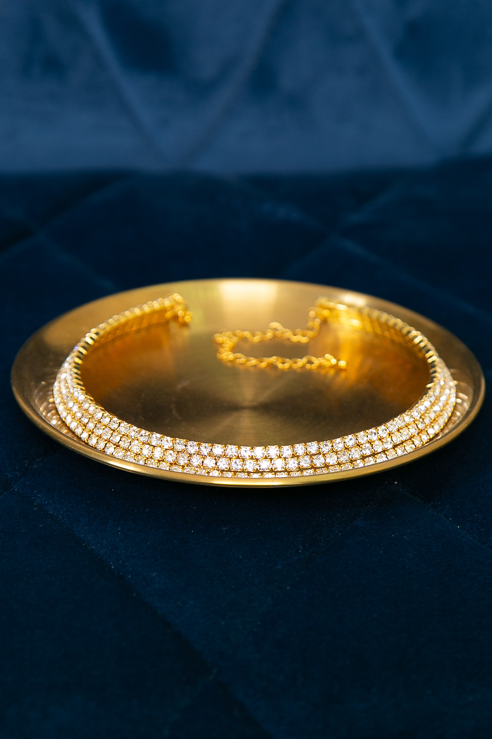 Золотой чокер на шею, состоящий из трёх рядов кристаллов.
