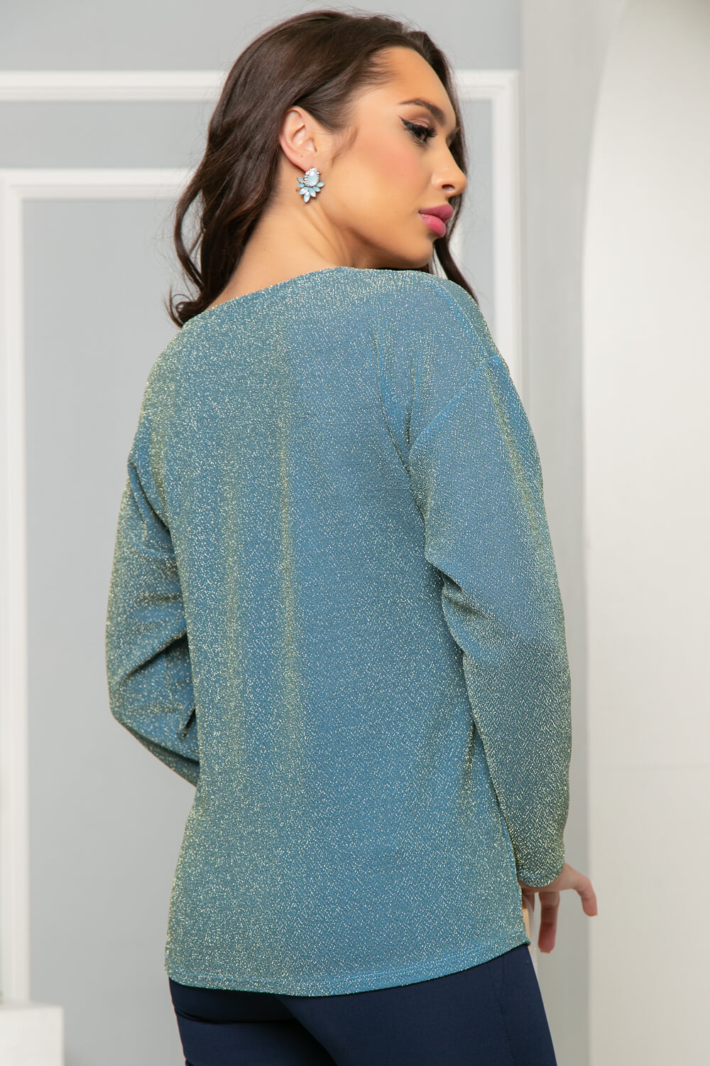 Джемпер из трикотажа с люрексом. Джемпер станет подходящим вариантом как для торжественных мероприятий: на праздник, корпоратив, новый год, так и для деловых, повседневных встреч и офиса. Актуален в любое время года весной, летом, осенью и зимой. По горловине украшен съёмной брошью, имеет втачной длинный рукав.