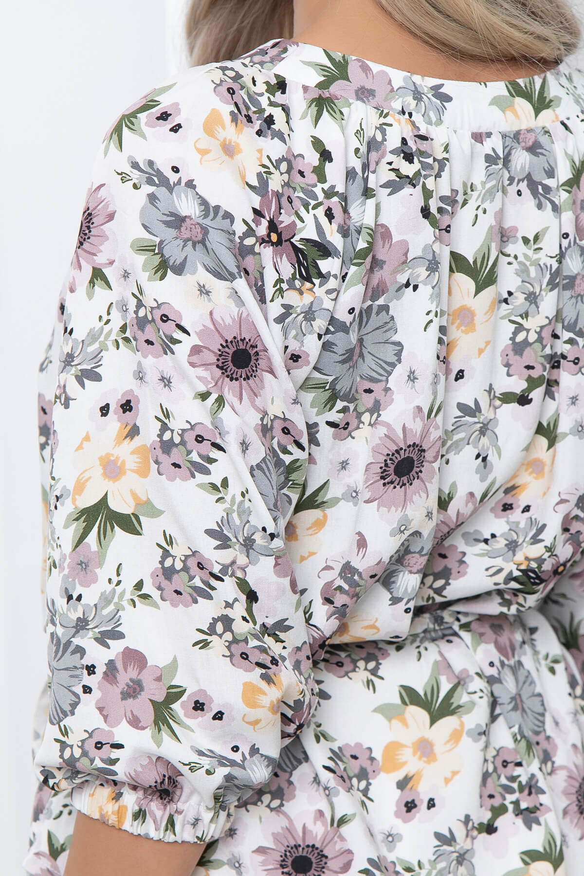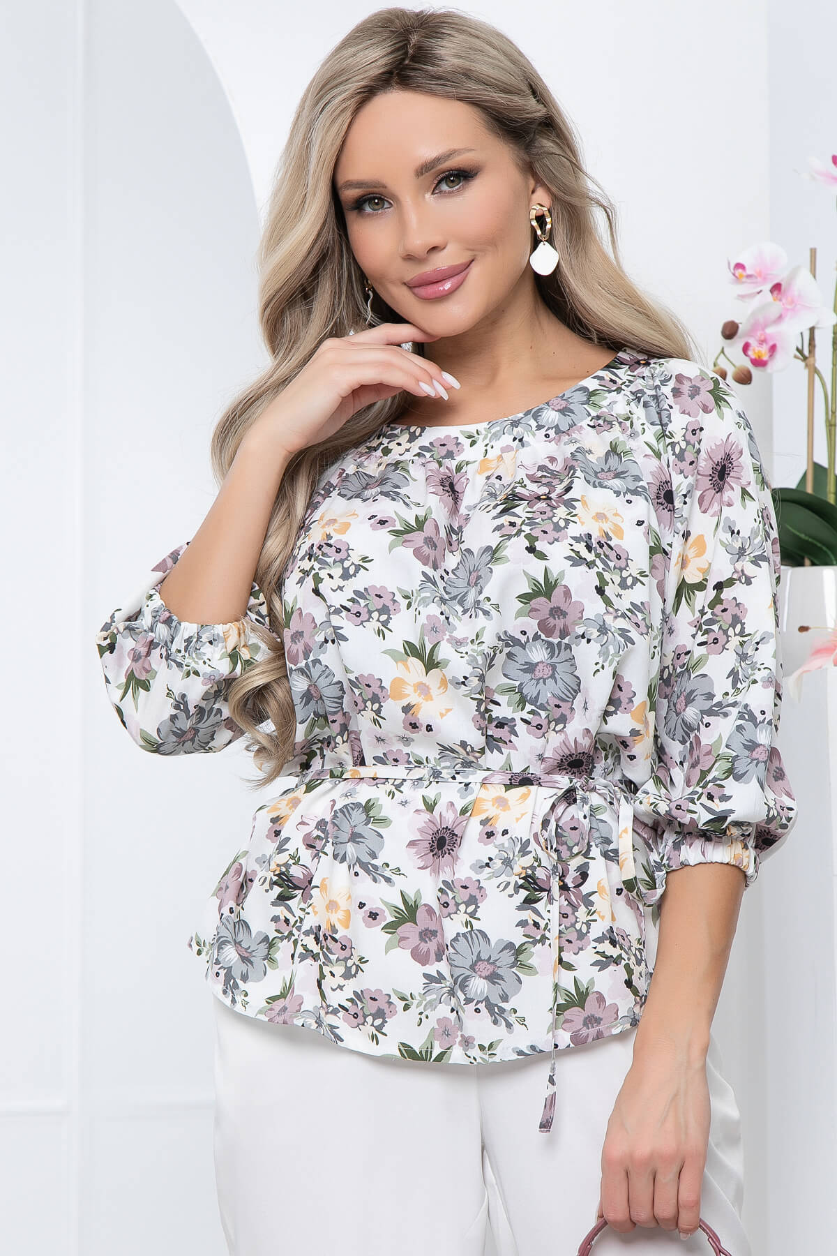 Очаровательная лёгкая блуза свободного кроя с завязками на талии, которые придадут образу изысканности. Округлый вырез горловины. Рукав втачной, три четверти, на манжете.