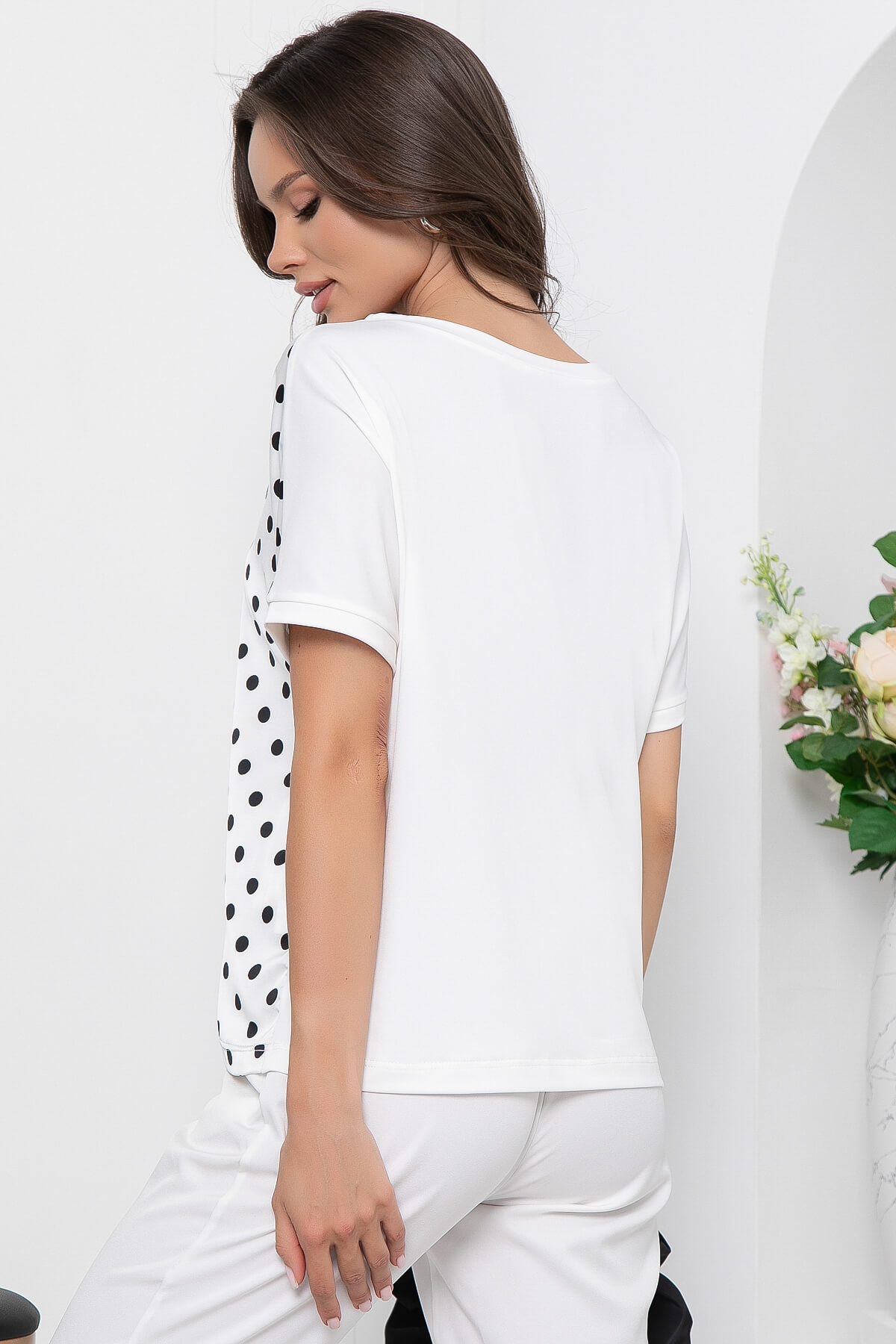 Базовые блузы - прекрасное дополнение к вашему гардеробу! Они универсальны и подойдут на любое мероприятие. Рукав укороченный, цельнокроенный. Изделие украшает стильный принт "горох" по переду.