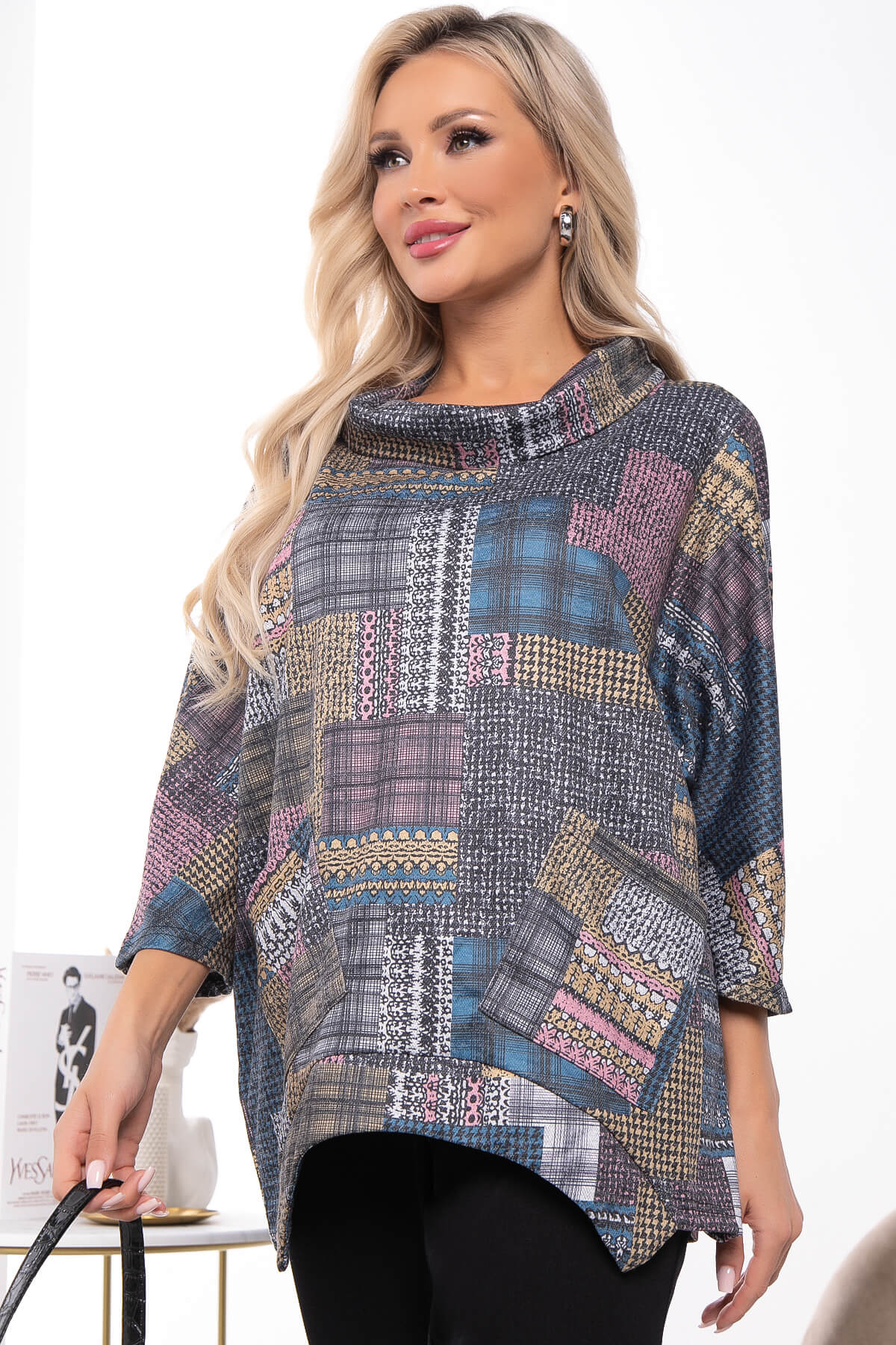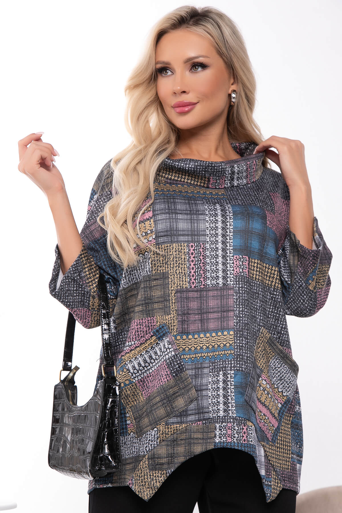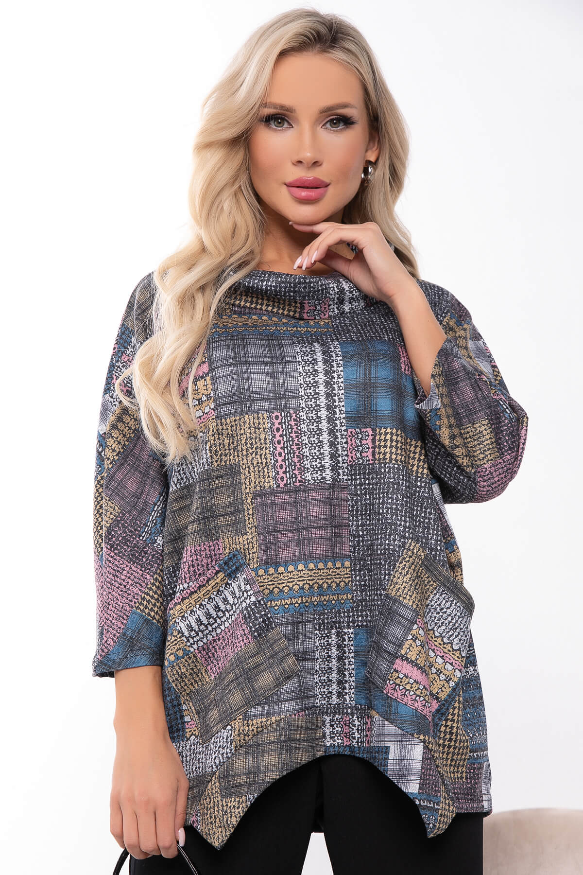 Тёплый и уютный джемпер из трикотажа - настоящая находка в прохладу. Джемпер имеет ассиметричный низ и поэтому хорошо будет смотреться в сочетании с облегающими брюками или лосинами. Рукав три четверти, цельнокроенный.