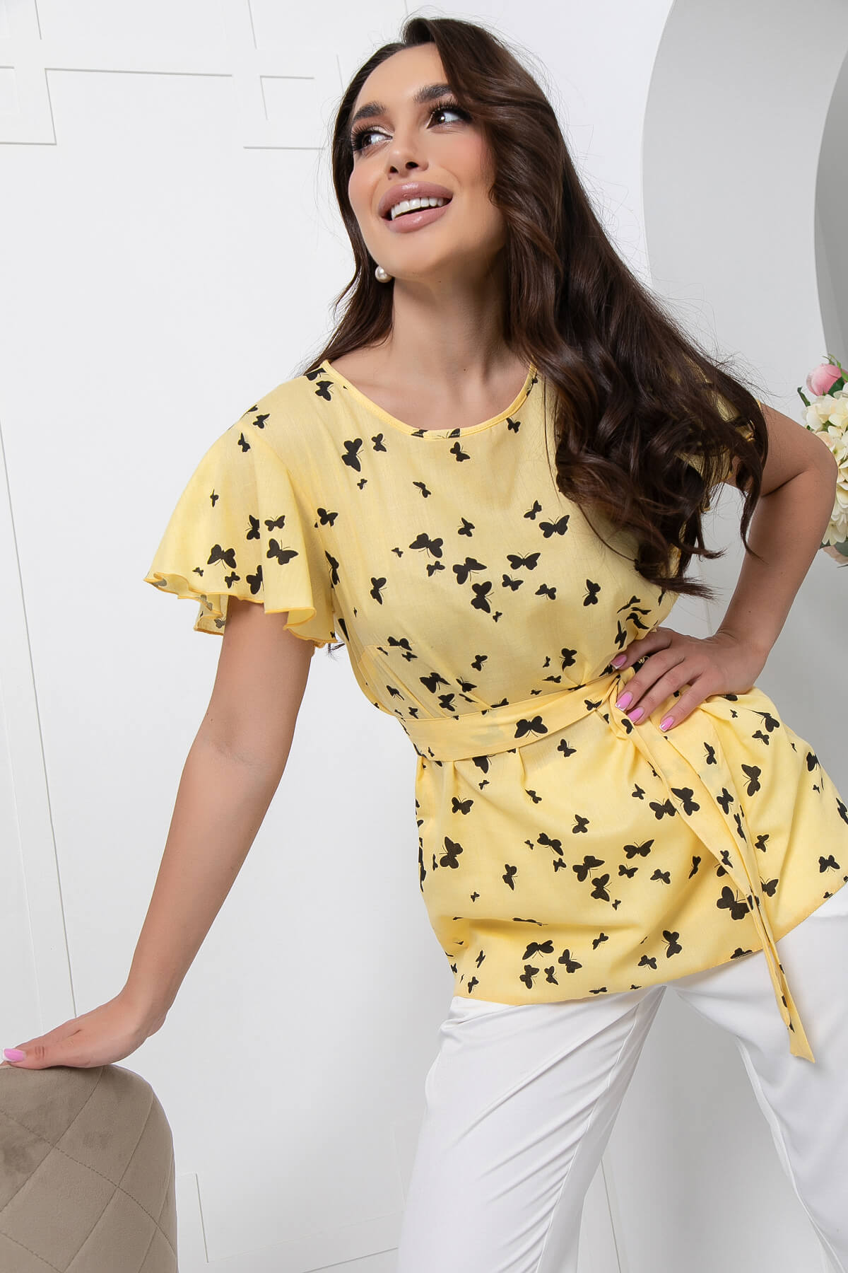 Блуза, выполненная из приятной к телу хлопковой ткани украсит собой лёгкий летний сет. Рукав-волан создаёт ощущение лёгкости и невесомости всего образа. В комплект входит пояс из основной ткани.