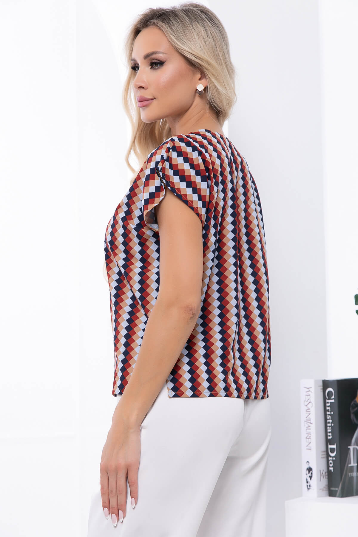 Женственная блуза подойдёт для создания делового и повседневного образа. Блуза свободного кроя, рукав цельнокроенный. По бокам есть небольшие разрезы.