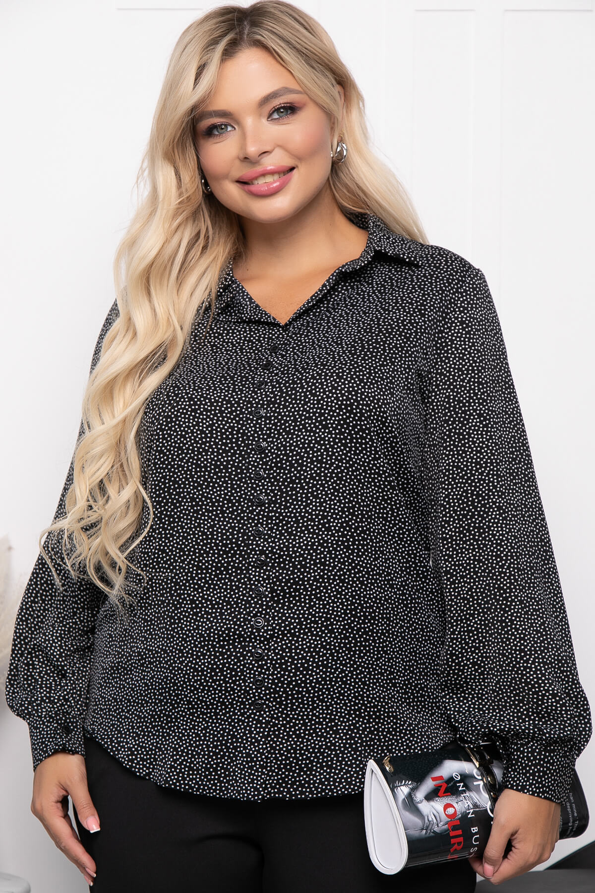 Классическая блуза в мелкий горошек - прекрасный вариант для офисных образов. Модель дополнена красивым акцентом - пышными рукавами на манжетах. По переду блузы выполнена имитация застежки на пуговицы.