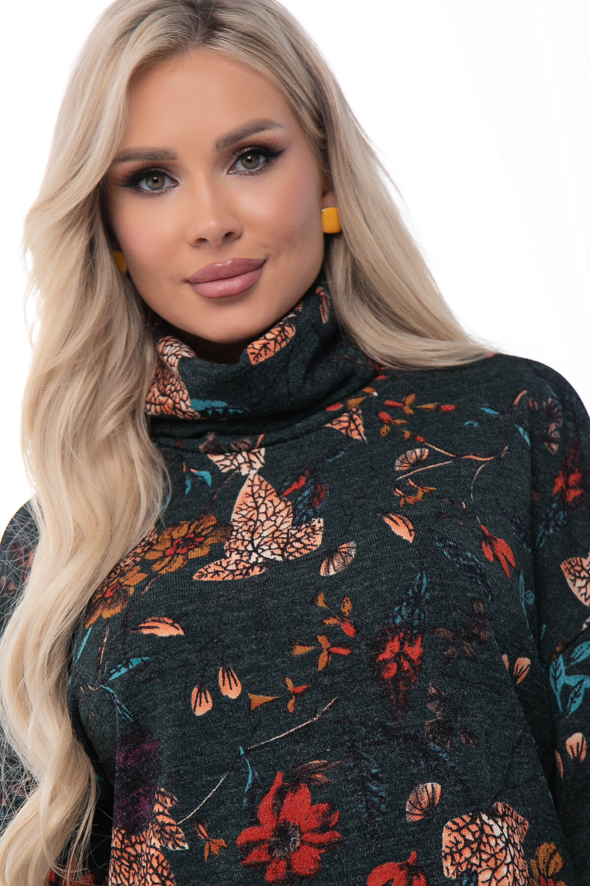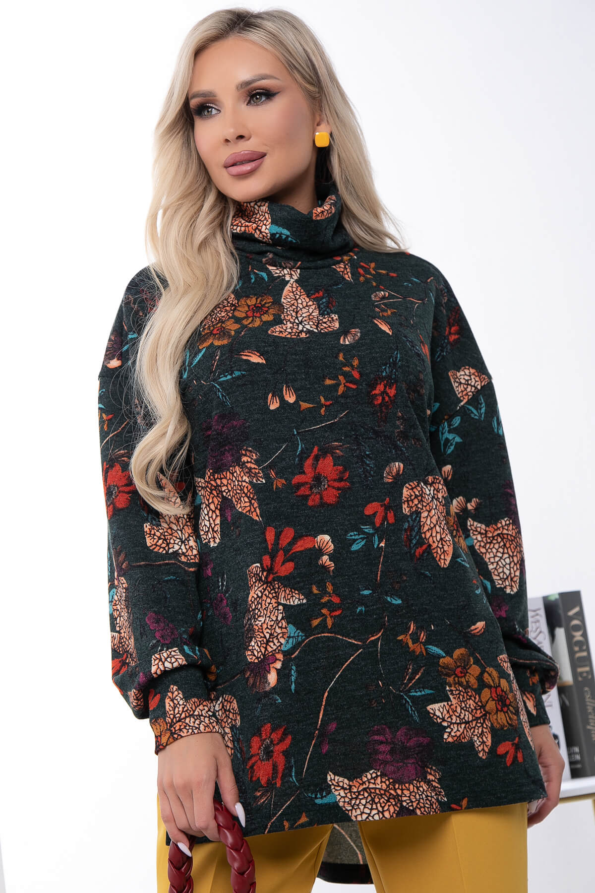 Горловина оформлена воротником "Хомут". По бокам джемпера есть разрезы.