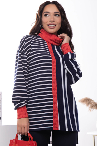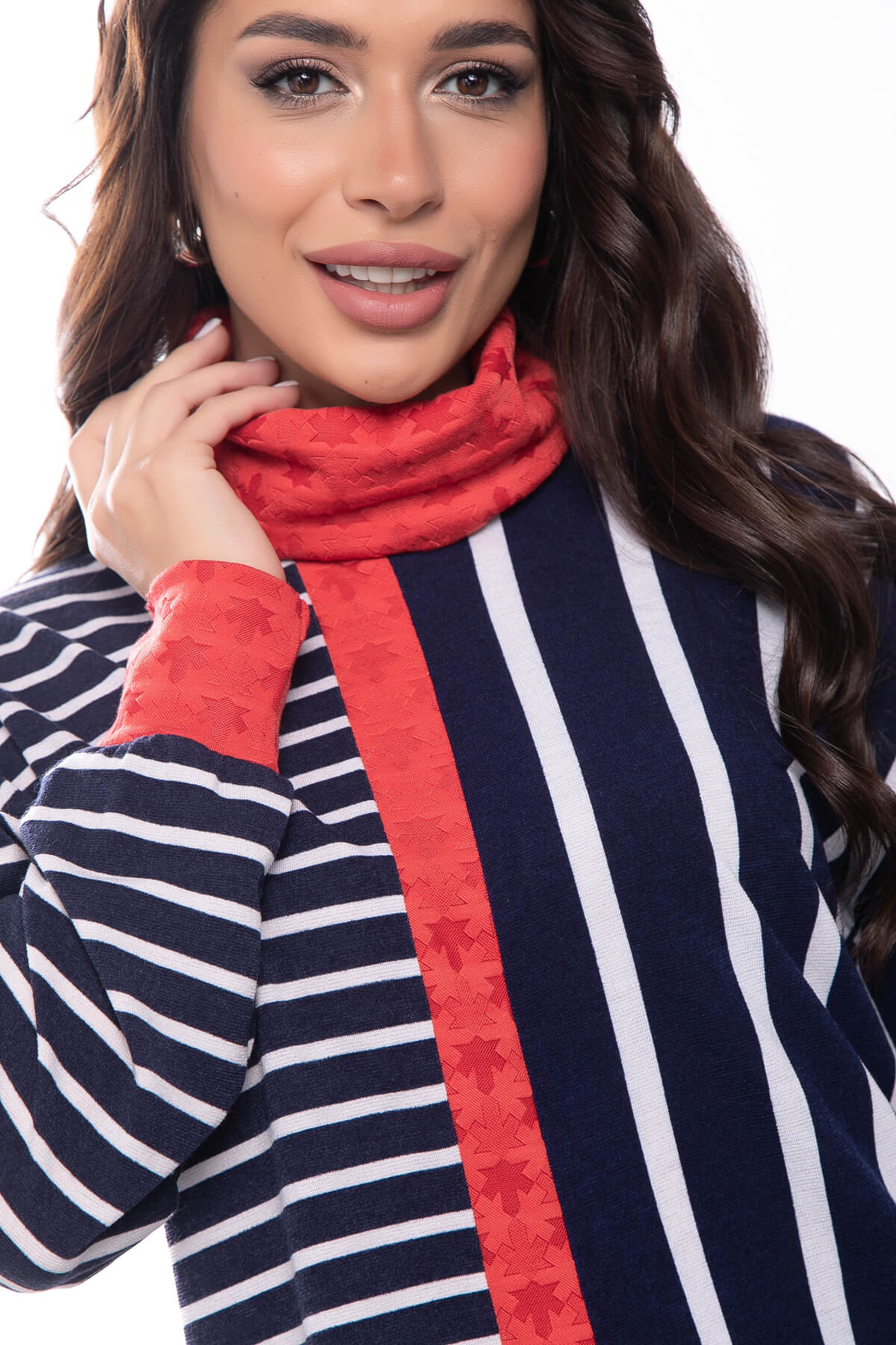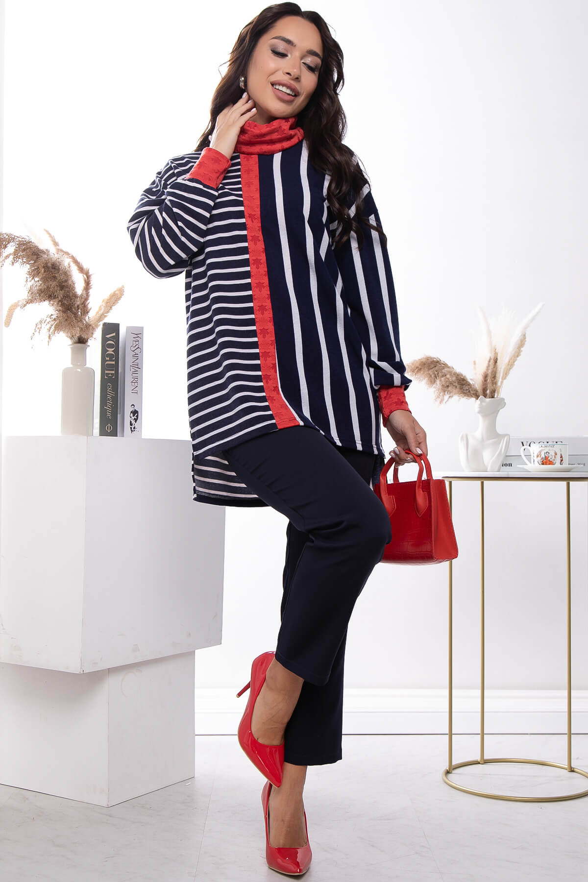 Тёплый и уютный джемпер из трикотажа с добавлением шерсти. Джемпер удлиненный и поэтому хорошо будет смотреться в сочетании с облегающими брюками или лосинами. Плечевой шов спущен, длинный втачной рукав на манжете.