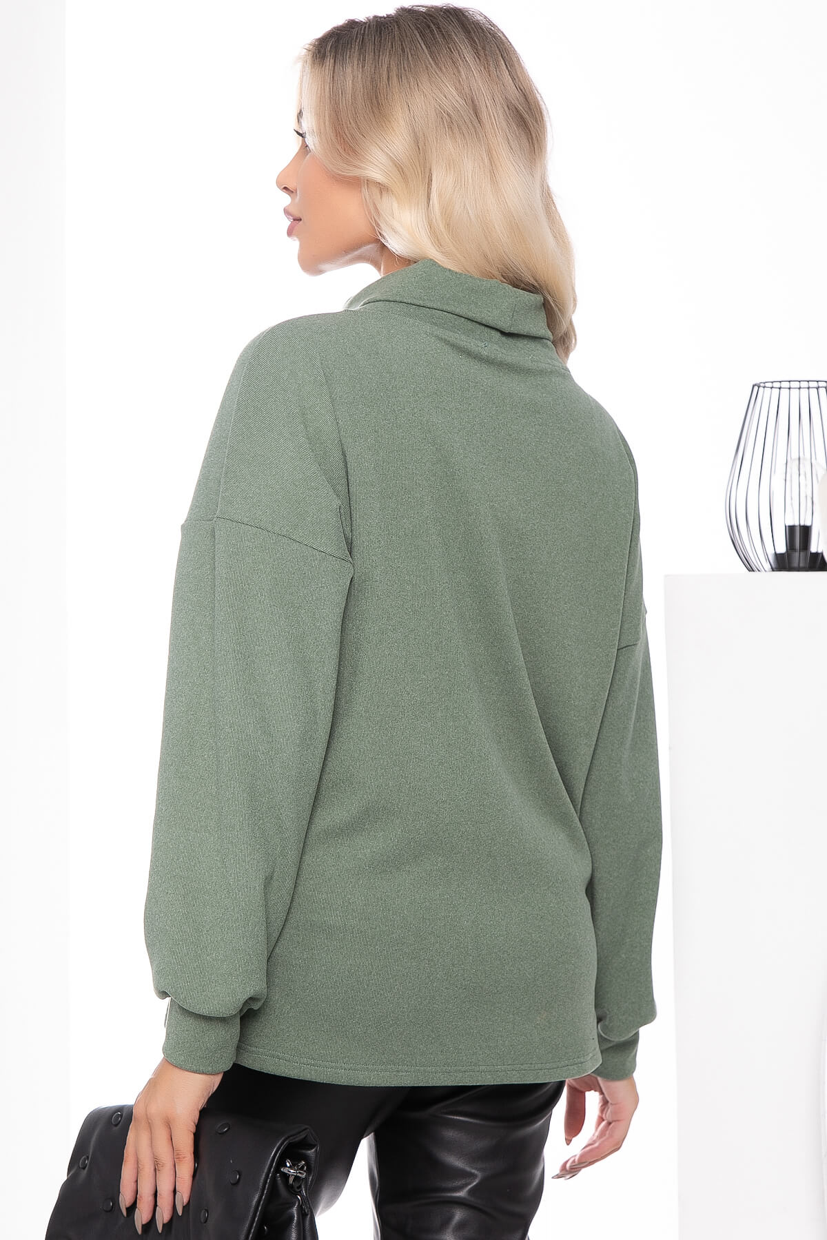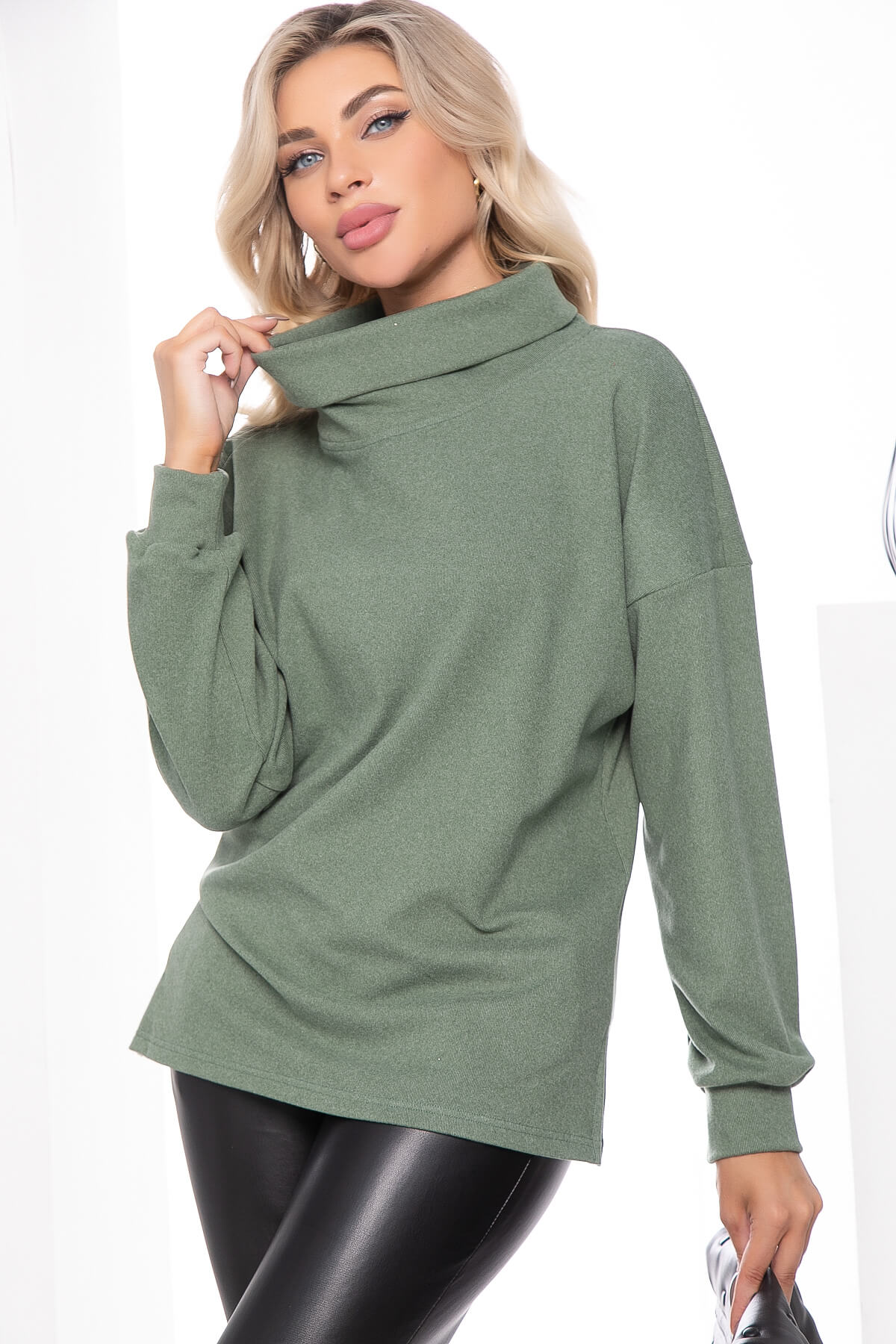 Тёплый и уютный джемпер из трикотажа с добавлением шерсти. Джемпер удлиненный и поэтому хорошо будет смотреться в сочетании с облегающими брюками или лосинами. Плечевой шов спущен, длинный втачной рукав на манжете. Горловина оформлена воротником "Хомут".