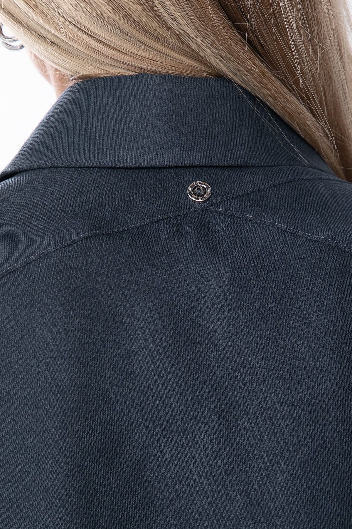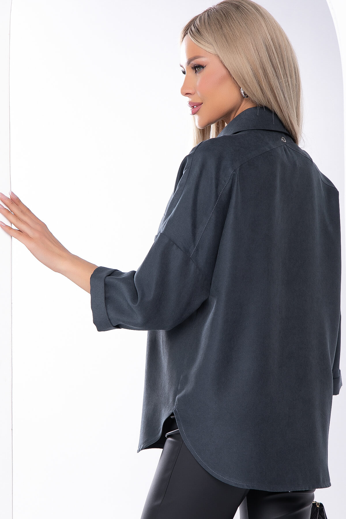 Рубашка из микровельвета в базовом оттенке поможет в создании комфортного тёплого образа. Рубашка полуприлегающего силуэта с рукавом три четверти. По переду застёгивается на пуговицы. На спинке асимметричная кокетка, декорированная пуговицей.Низ изделия закруглен.