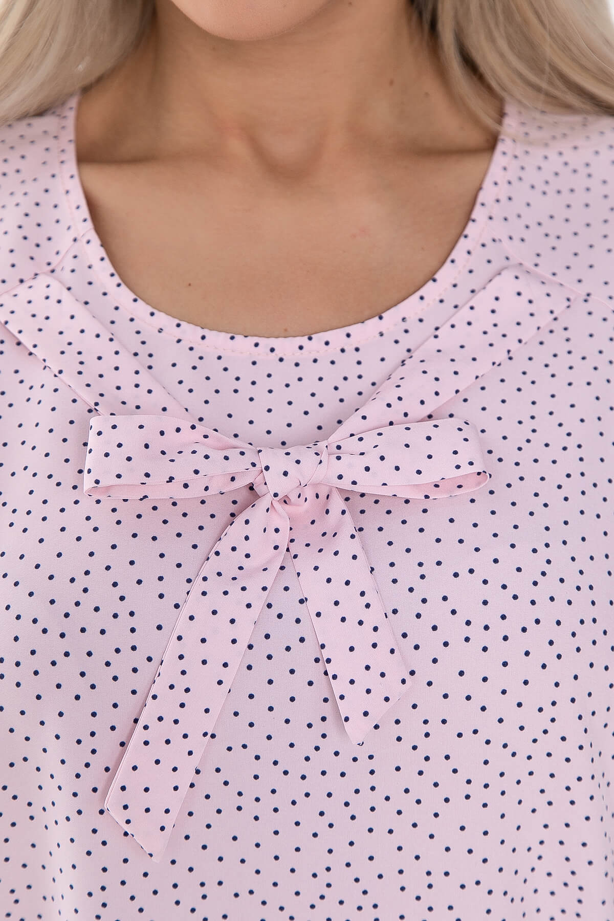 Женственная блуза с декорированным бантом выполненная из мягкого и приятного на ощупь материала, она обеспечивает комфорт и свободу движения. Актуальный принт и свободный силуэт делают эту блузку идеальной и универсальной. Рукав-реглан скроенный по типу "крылышко". Широкий размерный ряд позволяет носить блузу всем девушкам. Такая нежная модель отлично будет смотреться с однотонными брюками или юбками.