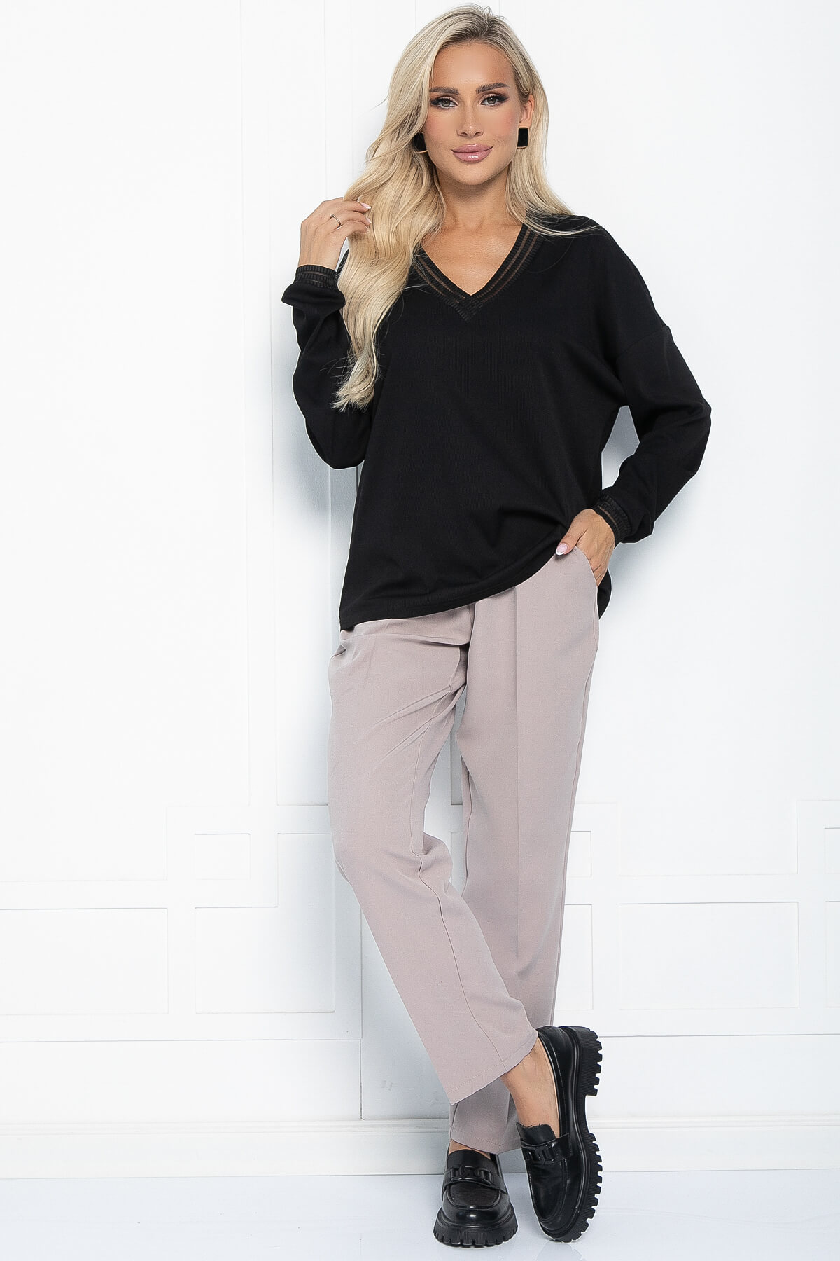 Базовый джемпер подойдёт для создания повседневных и офисных образов. Акцентные вставки из сетки деликатно украшают образ. Изделие имеет полуприлегающий силуэт, втачной длинный рукав со спущенным плечевым швом. Можно носить навыпуск или под заправку. Благодаря своему оттенку хорошо сочетается практически с любым низом.