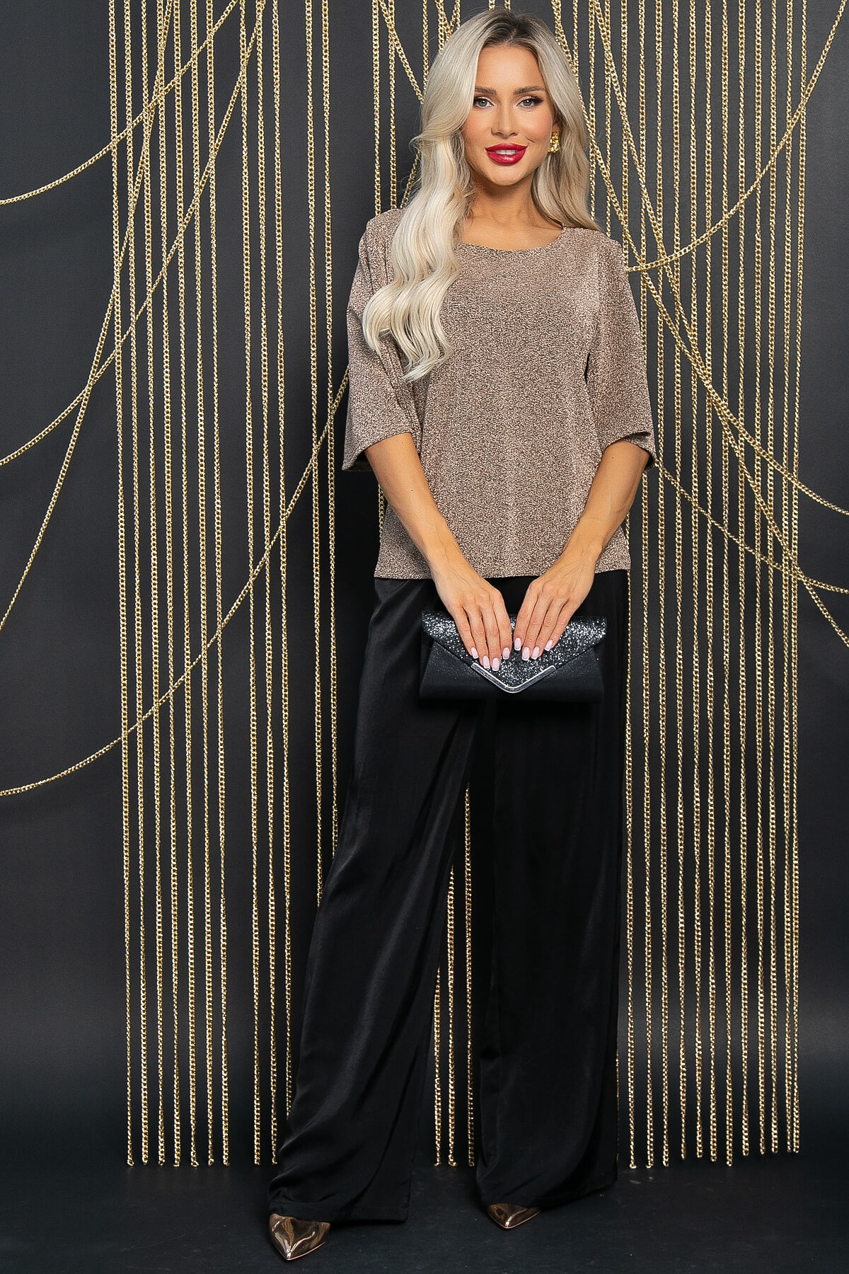Трикотажная блузка с люрексом — это отличный выбор для самых разных событий: Нового года, корпоратива, вечеринки, театра, свадьбы или юбилея. Эта блузка свободного кроя с эффектными рукавами «крылышко» привлечёт внимание к вашему образу. На спинке расположен декоративный вырез, который добавляет изюминку. Её можно легко сочетать с юбкой или с брюками. По бокам есть разрезы. В этой блузке вы точно не останетесь незамеченной!
