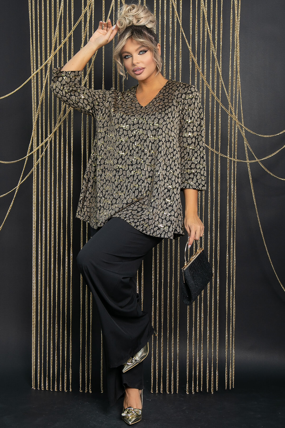 Нарядная туника свободного кроя из приятного трикотажа с пайетками. Легкая, удобная и струящаяся туника обеспечит комфорт и свободу движений. С передней стороны туника имеет красивые фалды, которые добавляют изделию особый шик. Пайетки красиво переливаются и создают ощущение праздника. Такая туника будет шикарно смотреться с брюками и позволит вам блистать на любом празднике. Создайте себе хорошее настроение и будьте самой нарядной!