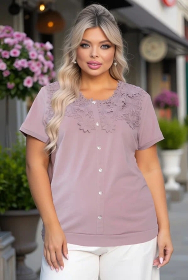 Однотонная модель станет прекрасным дополнением к вашему базовому гардеробу, привнося нотки оригинальности в повседневные образы. Спереди она украшена стильной имитацией пуговиц и кружевом, что создает интересный акцент.