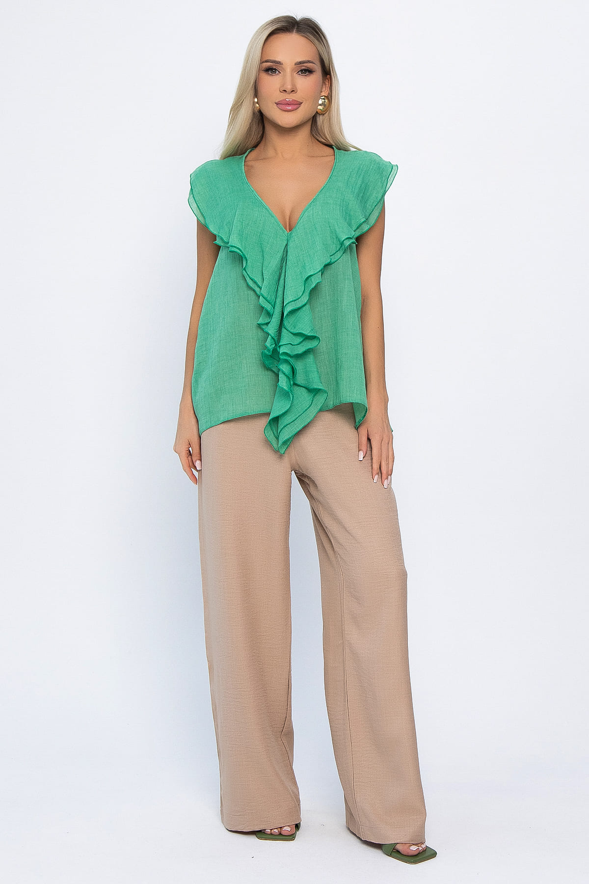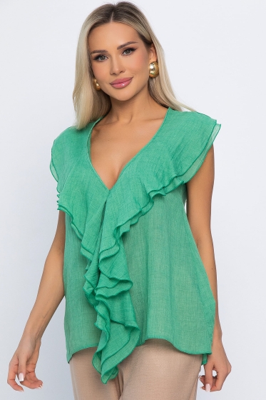 Воздушная зелёная блузка с воланами — настоящая находка для жаркого лета! Она изготовлена из дышащего материала, который обеспечивает комфорт на протяжении всего дня. Воланы на передней части придают образу романтичность и игривость. Эта блузка отличается простым и лаконичным дизайном, благодаря чему легко сочетается с пиджаками и любыми другими элементами гардероба. Сделайте свой образ лёгким и стильным с этой блузкой!