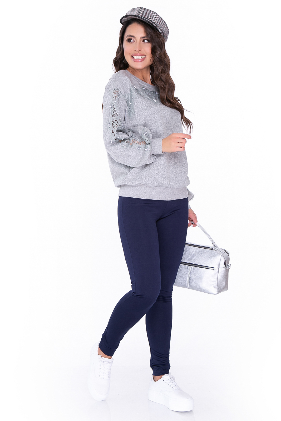 - Джемпер из мягкого трикотажа в базовом сером оттенке;