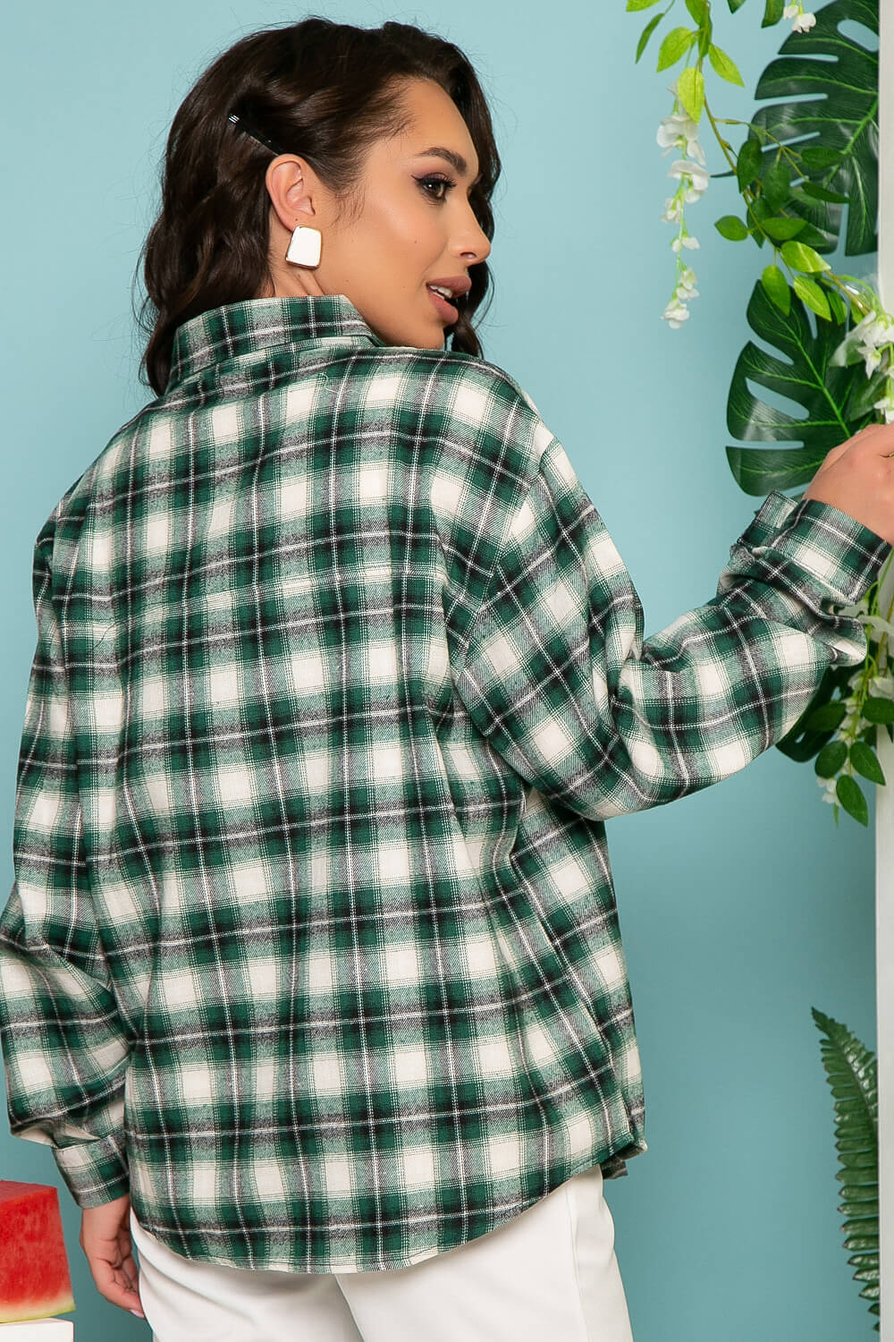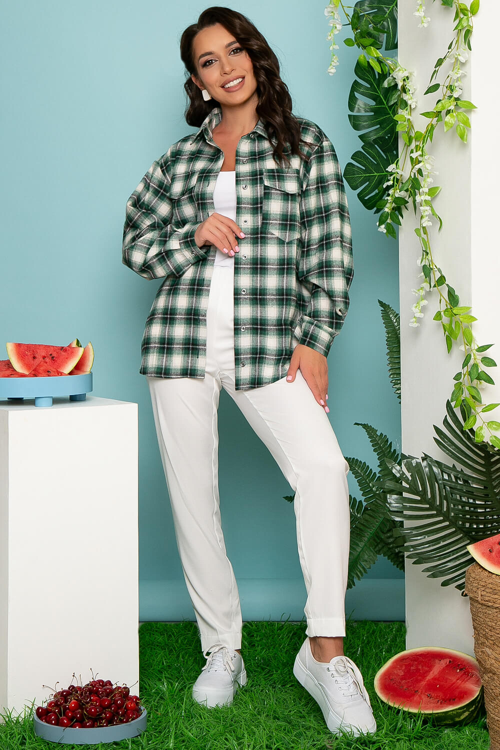 Мягкая рубашка в клетку с лёгкостью заменит привычные варианты летнего второго слоя одежды. Рубашка свободного кроя с отложным воротничком, на пуговицах, на груди функциональные карманы с клапаном. Низ рубашки закруглен, спинка удлинена. Рукав длинный, втачной, манжет застёгивается на пуговицу.