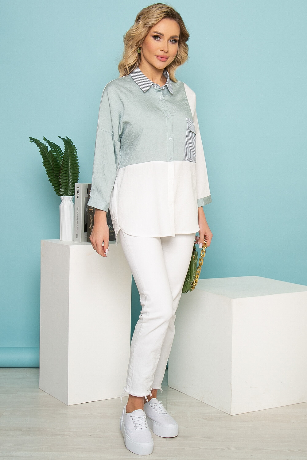 Рубашка из хлопка - идеальный вариант для весенне-летнего гардероба. Идеально будет сочетаться с джинсами, брюками или юбками. Рубашка со спущенным плечевым швом, рукав семь восьмых, по переду застёгивается на пуговицы. Спинка удлинена. Рубашечный воротничок, на груди есть функциональный кармашек.