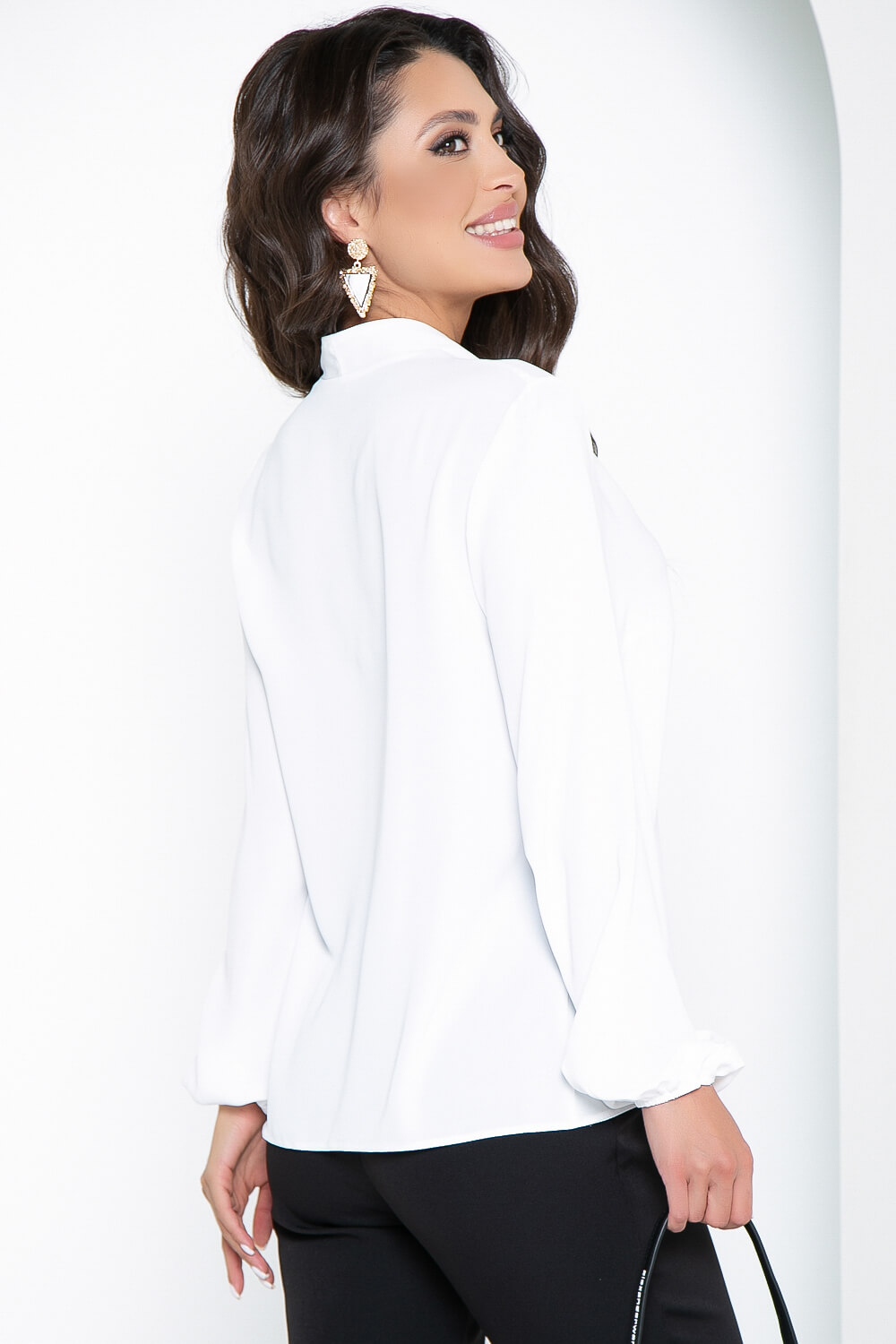 Женственная белая блуза классического кроя. Рукав втачной, длинный, низ на резинке. Мягкий V-образный вырез красиво подчеркивает зону декольте. По переду планка.