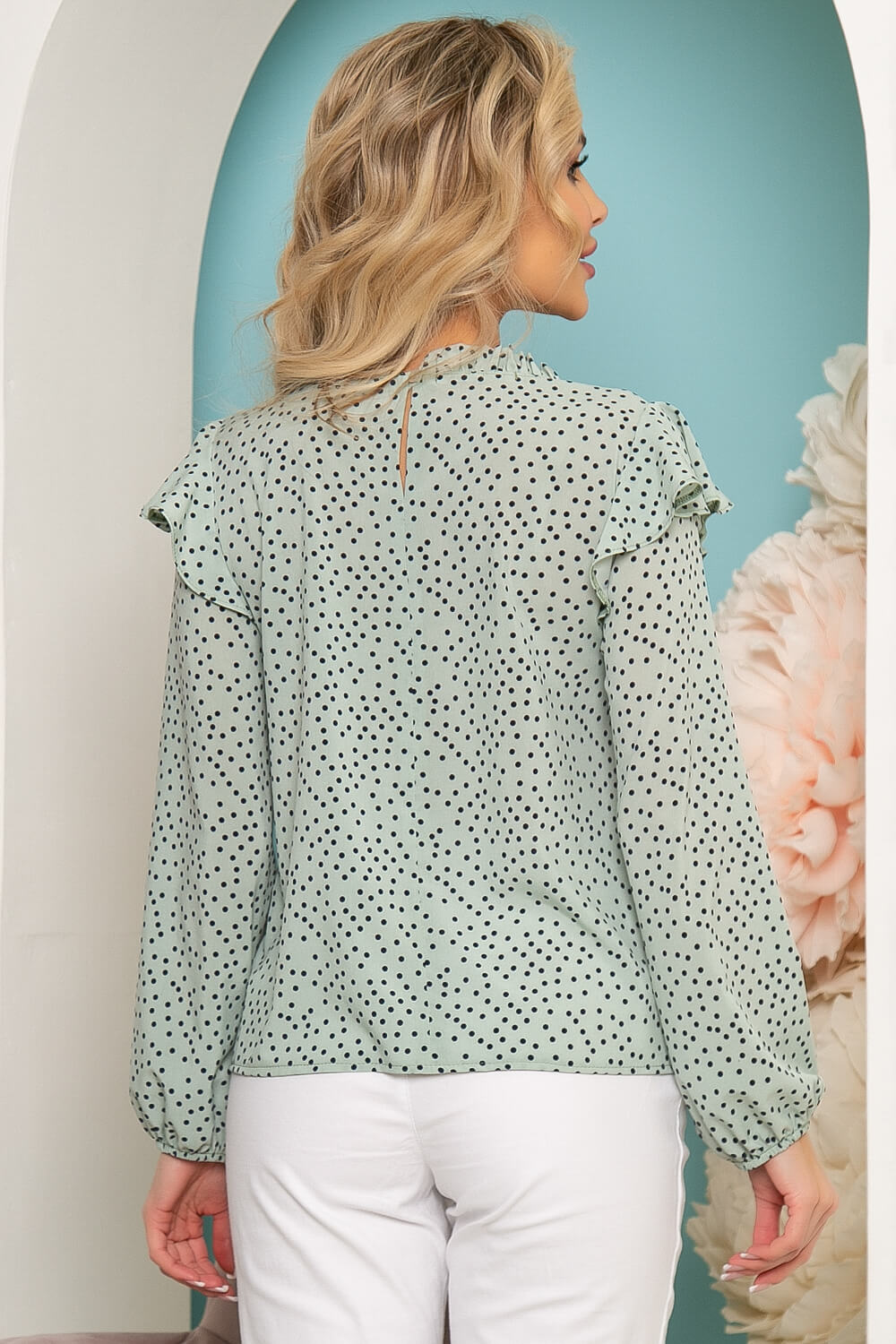 Блуза в горошек для создания привлекательного образа. Свободный крой, рукав втачной, длинный, по низу на резинке. В плечевых швах воланы-крылышки, округлый вырез горловины, оформленный сборкой. По спинке застёжка "Петля-пуговица".