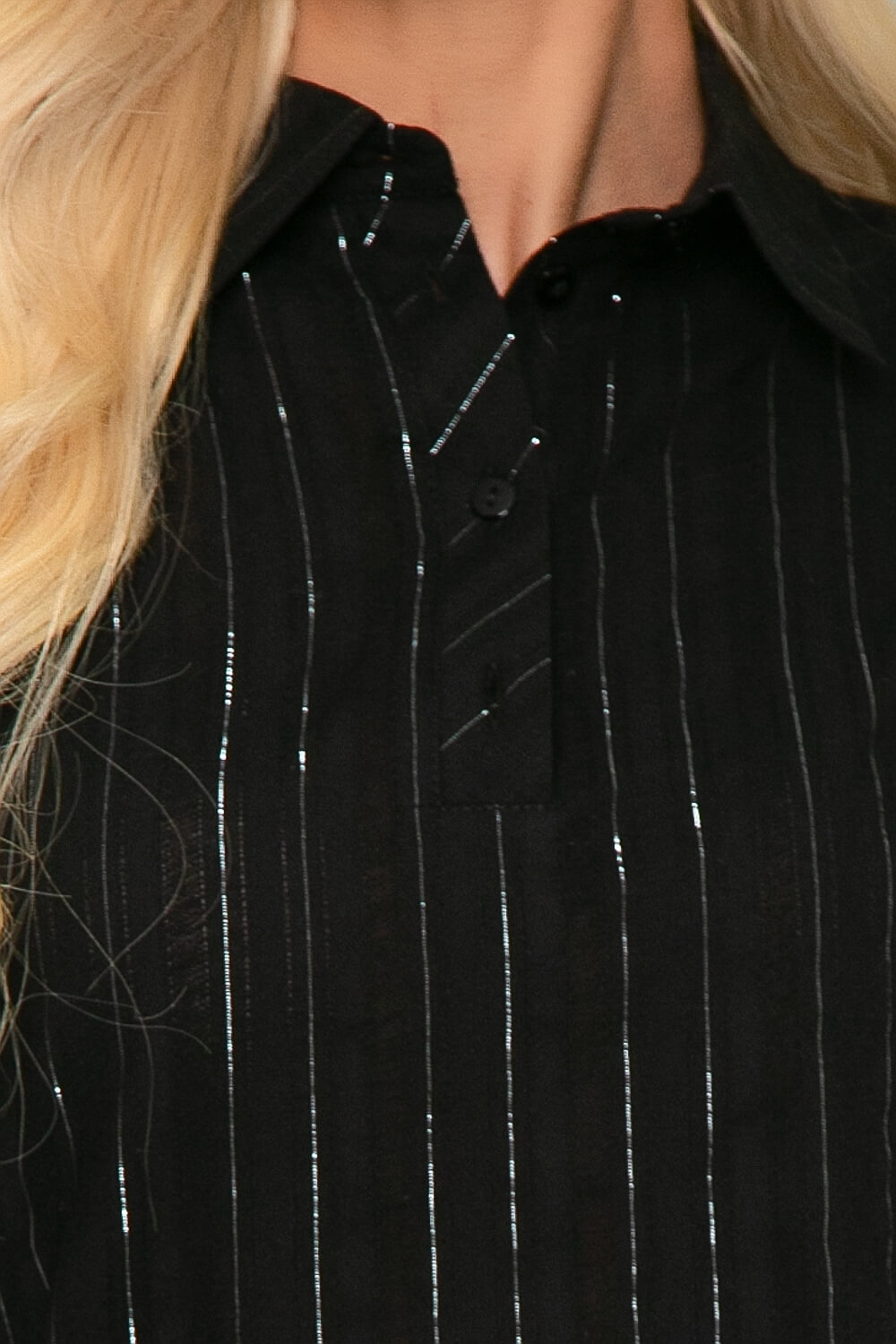 Лёгкая блуза свободного кроя в классическом чёрном оттенке с серебряной нитью. Блуза с удлиненной спинкой, края скруглены, по бокам разрезы. Классический отложной воротничок, по переду застёгивается на 4 пуговицы. Рукав три четверти, на манжете.