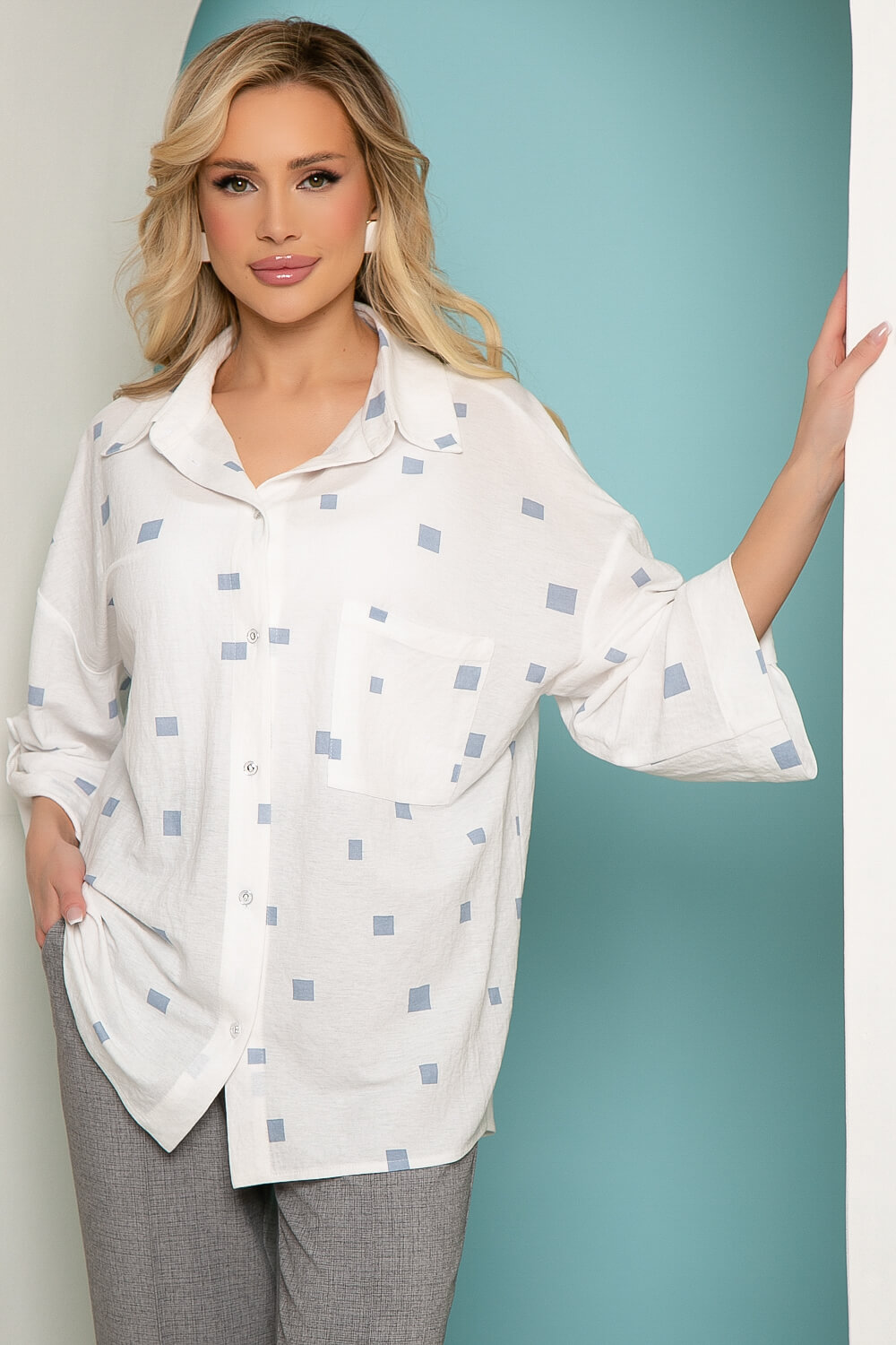 Хлопковая рубашка - прекрасный вариант для создания огромного количества разнообразных образов. Можно надеть в качестве верхнего слоя или, как самостоятельный элемент. Рубашка свободного кроя с отложным воротничком. Рукав укороченный, свободный, семь восьмых. Рукав застёгивается на пату.