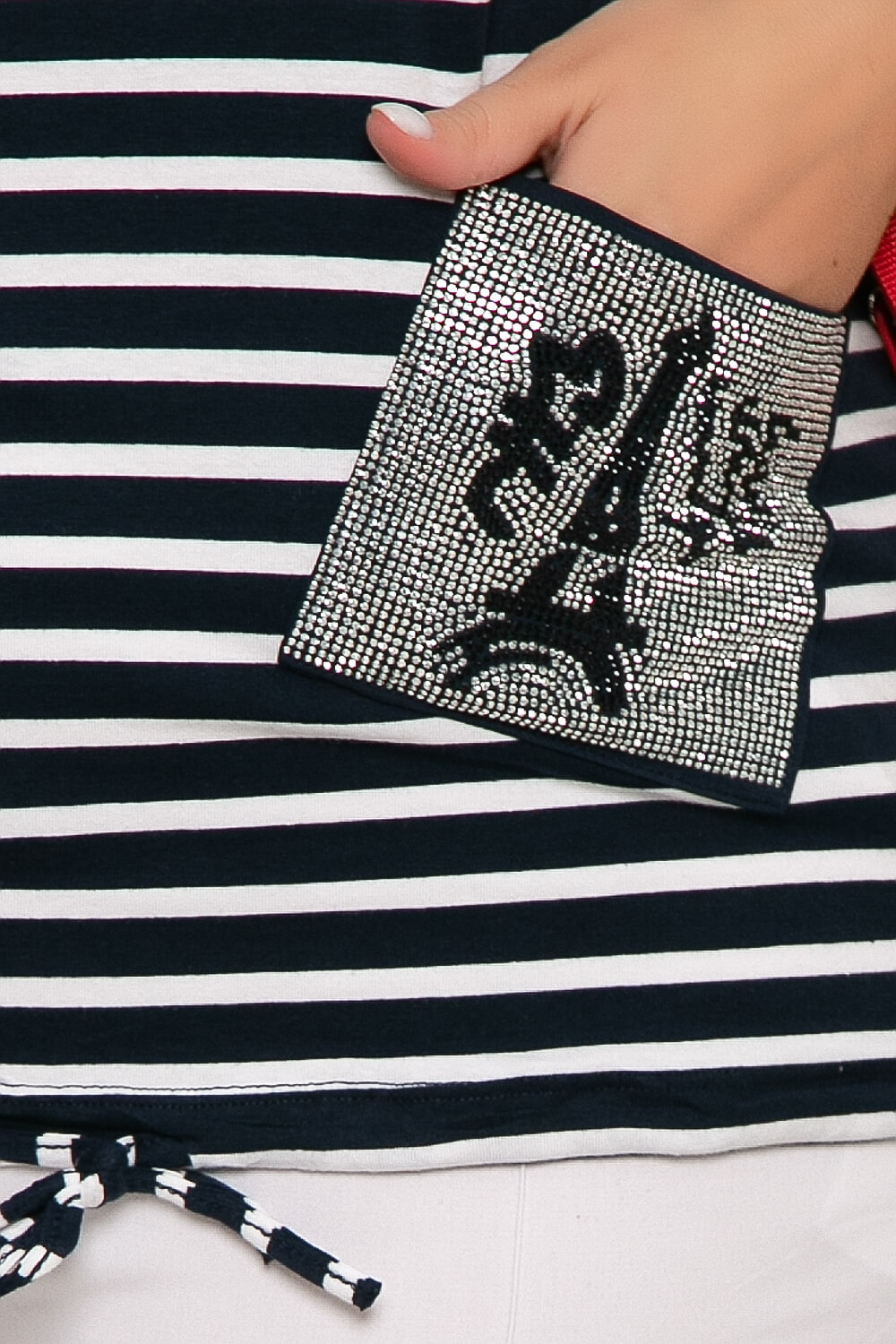 Футболка с рукавом 3/4 из плотного трикотажа с декором из страз. Прекрасно сочетается с джинсами, лосинами, брючками. Футболка свободного кроя, рукав втачной, три четверти. Низ футболки украшают два накладных кармана, декорированных стразами. По низу кулиска.