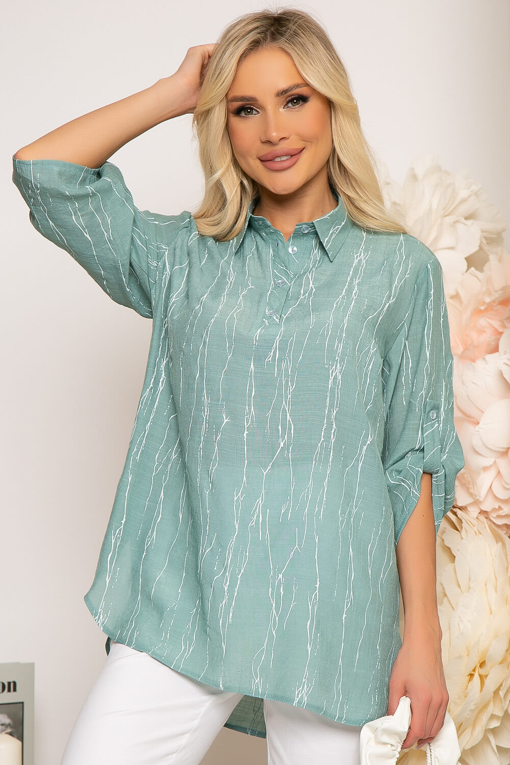 Невесомая блуза-флюид в красивом мятном оттенке. Блуза свободного кроя, с удлиненной спинкой, края скруглены, по бокам разрезы. Классический отложной воротничок, по переду застёгивается на пуговицы. Рукав три четверти, застёгивается на пату.
