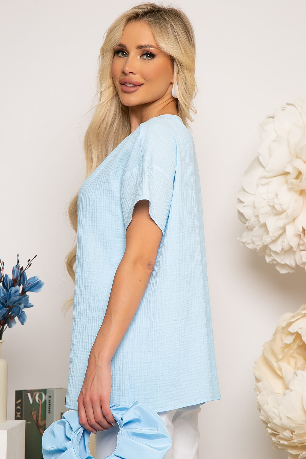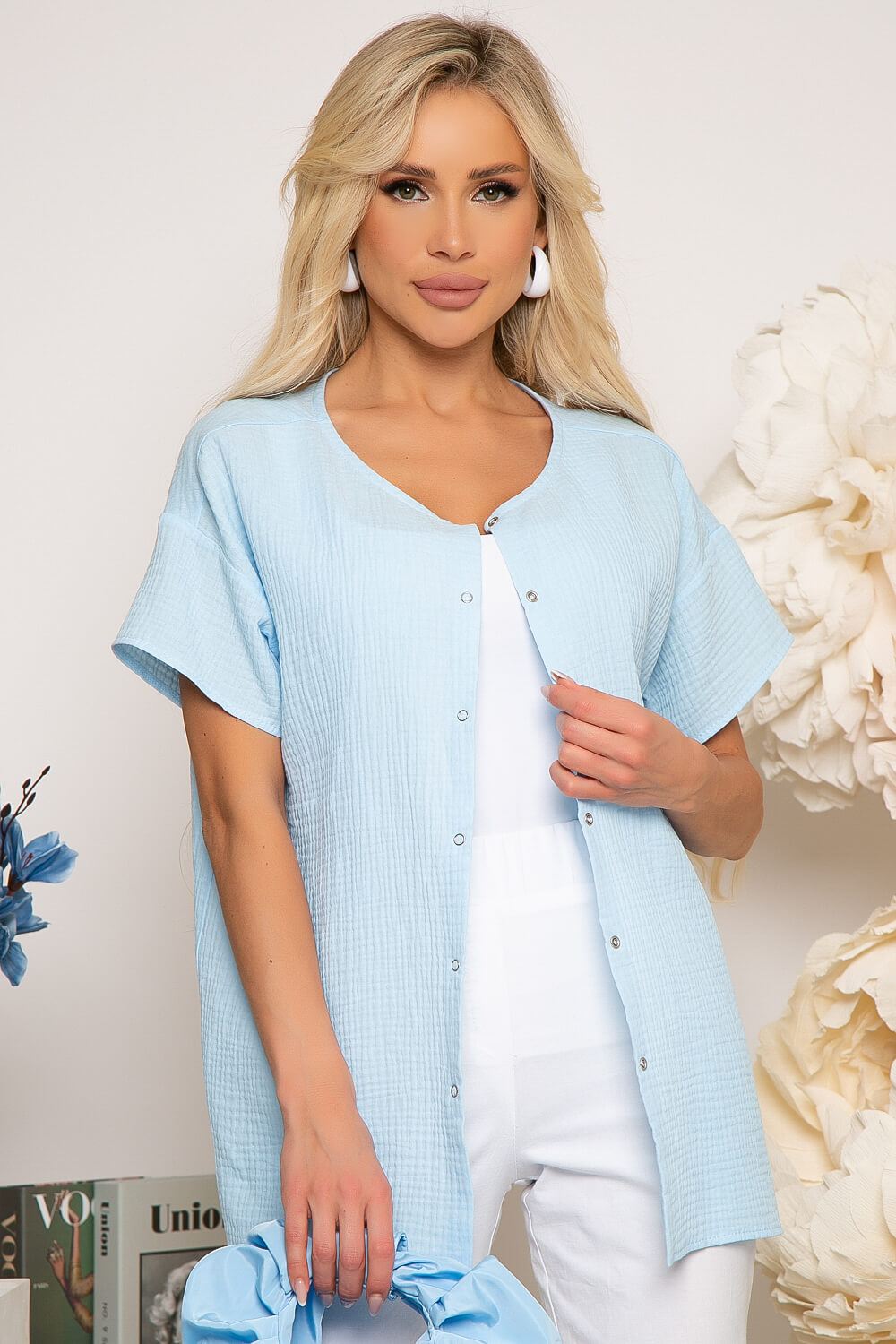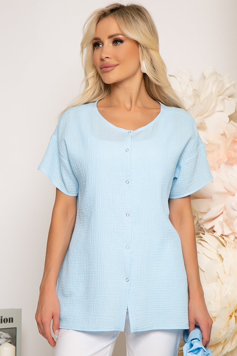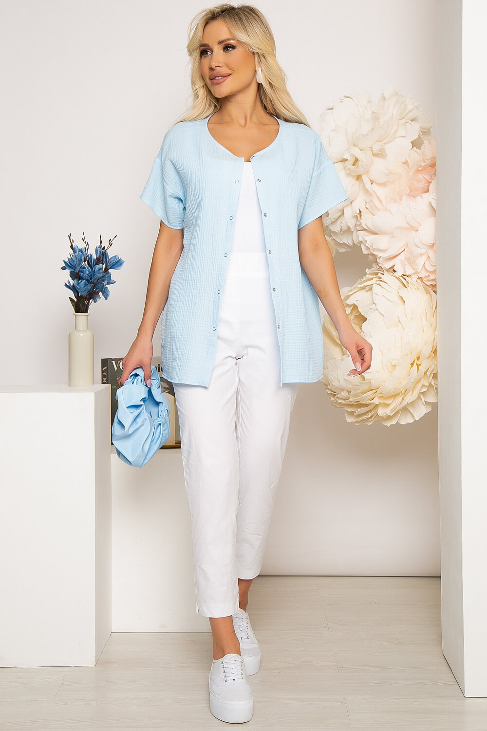 Блуза свободного кроя в красивом нежно-голубом оттенке из муслина. По переду застегивается на маленькие, аккуратные кнопки. Рукав втачной, короткий, плечо спущено. Блузу можно использовать, как второй слой, надев, её на майку или топ. А можно использовать, как основной слой. Блуза невероятно лёгкая, невесомая и приятная к телу.