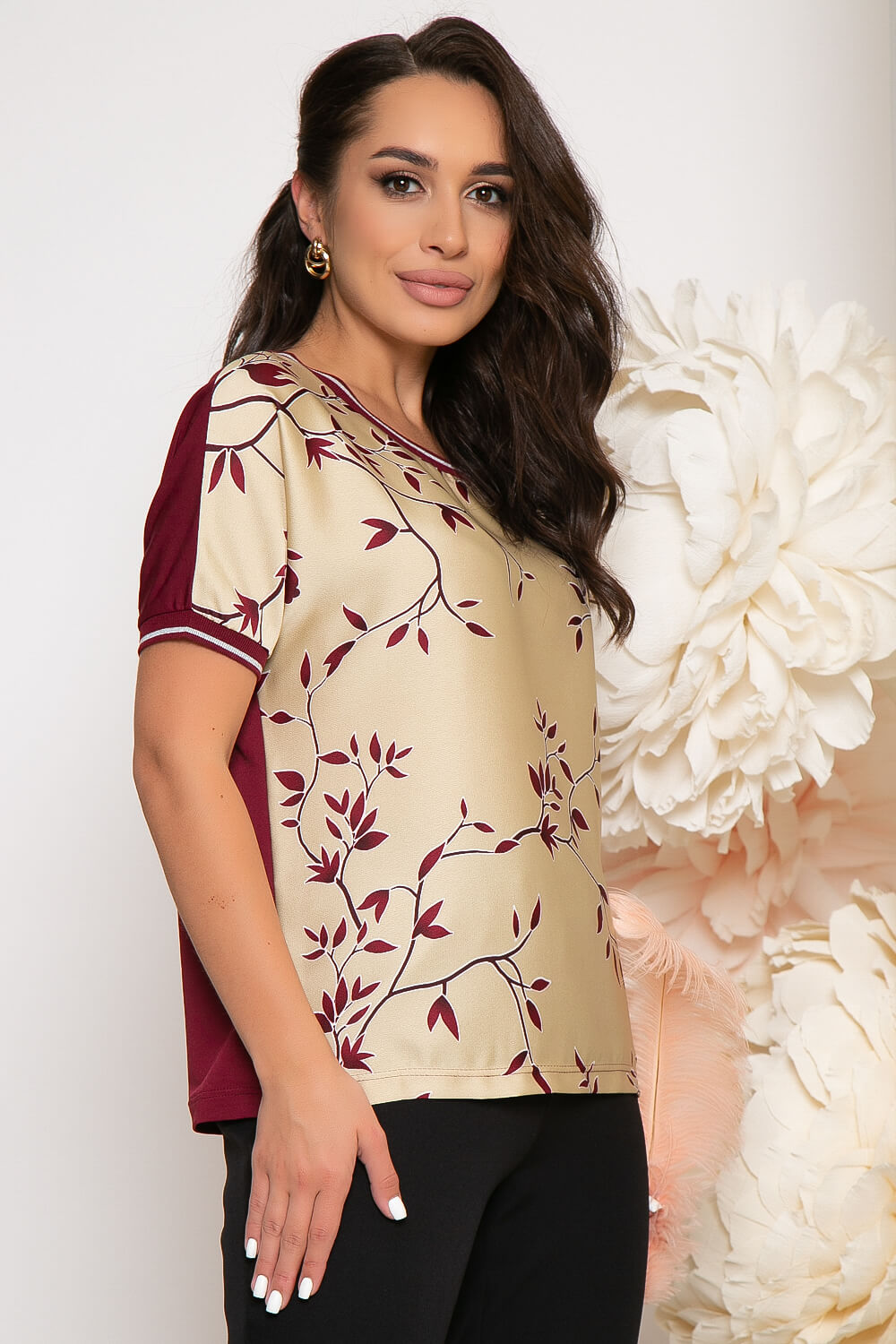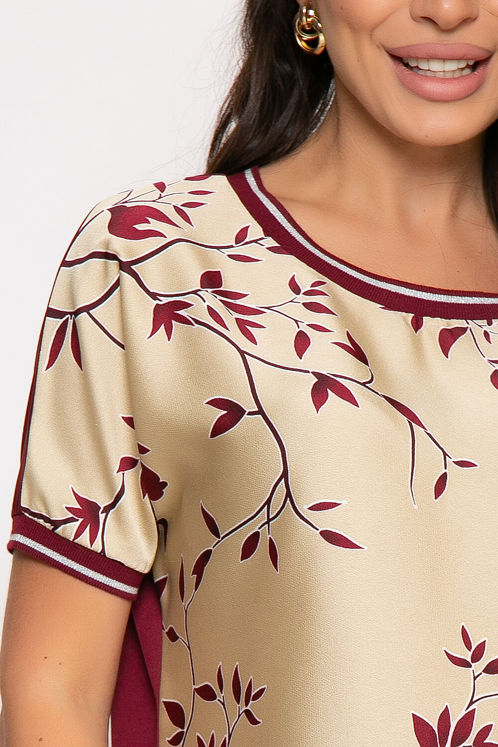 Блуза вишнёвого цвета в необычном исполнении с коротким рукавом. Это базовая вещь, которая одновременно и проста, и изящна, и универсальна. В данном случае представлена блуза в красивом бордовом оттенке с принтом и трикотажными подвязами по рукавам и горловине. Рукав цельнокроенный. Ткань имеет характерный сатиновый отблеск.