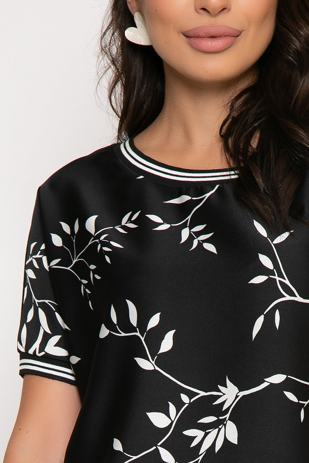 Блуза чёрного цвета в современном исполнении с коротким рукавом. Это базовая вещь, которая одновременно и проста, и изящна, и универсальна. В данном случае представлена блуза в классическом чёрном оттенке с принтом и трикотажными подвязами по рукавам и горловине. Рукав цельнокроенный. Ткань имеет характерный сатиновый отблеск.