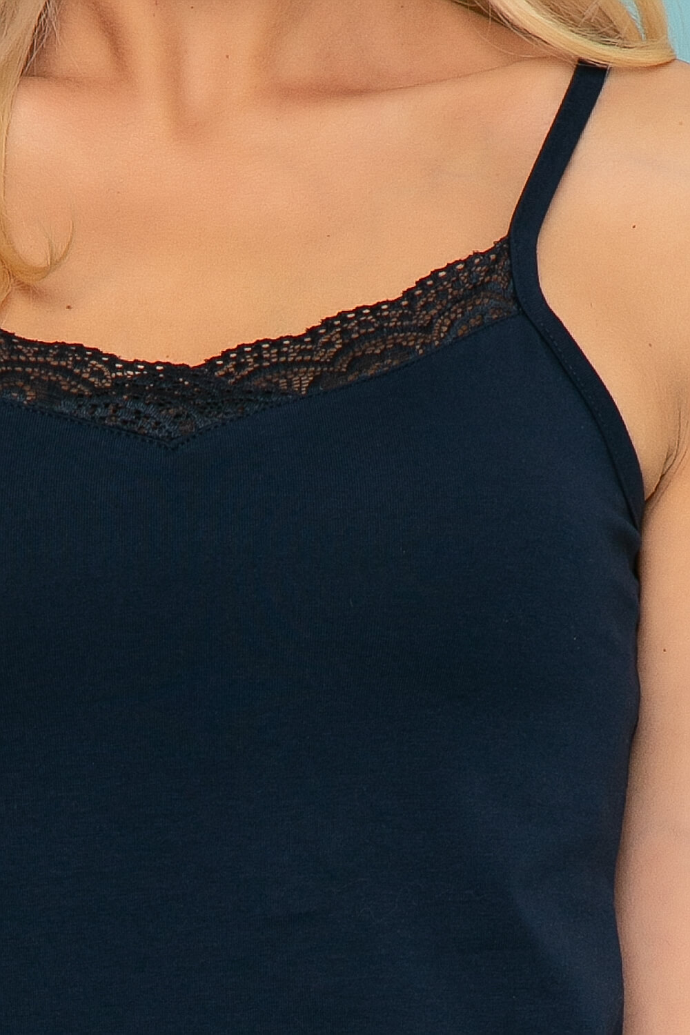 Топ в бельевом стиле на бретелях, украшенный гипюром, создан для элегантного повседневного образа. Если дополнить правильными аксессуарами, легко можно создать женственный вечерний образ.