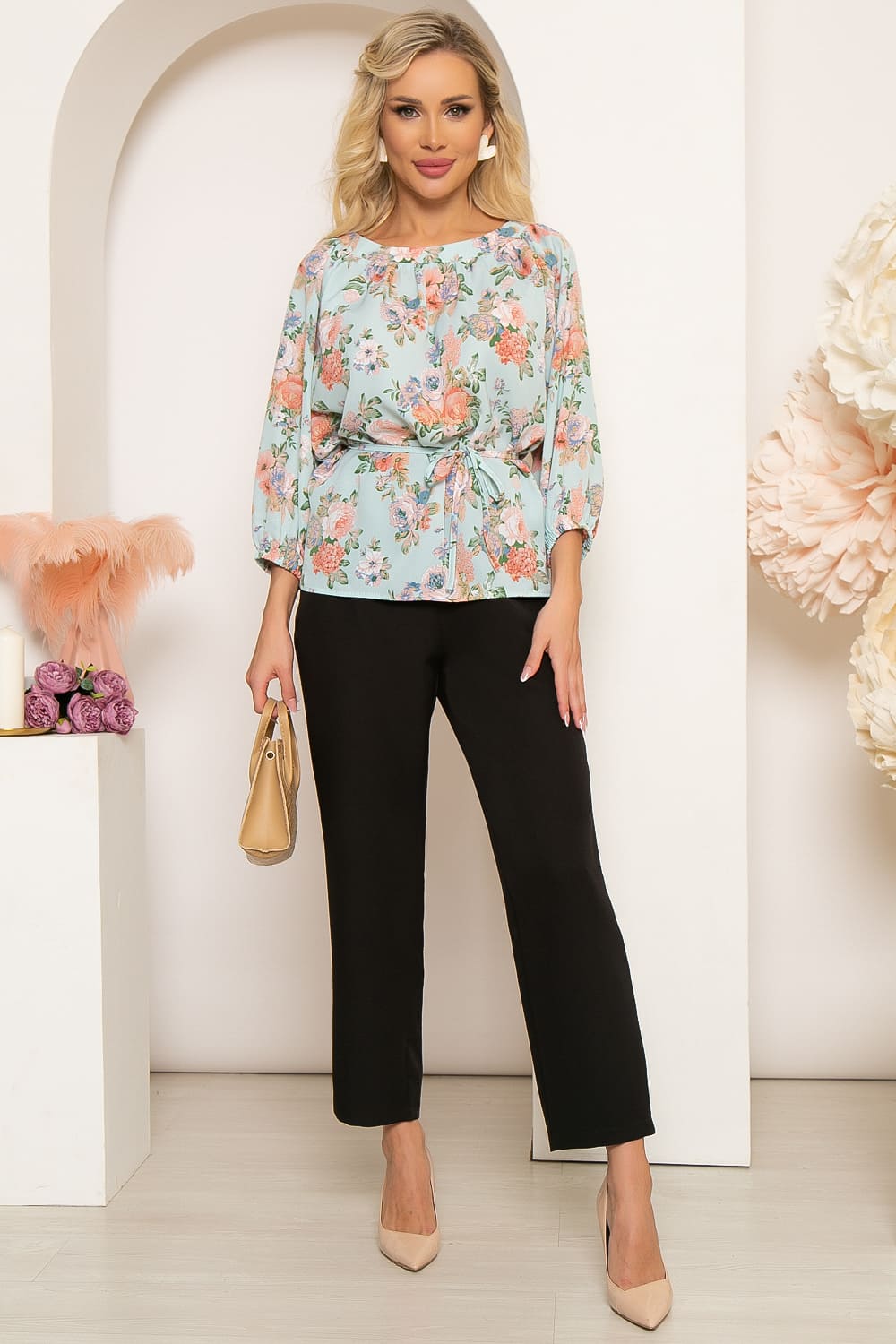 Блуза с цветочным принтом смотрится естественно и свежо на каждой женщине, независимо от возраста и типа фигуры. Свободный крой обеспечит комфортную посадку и не будет сковывать движений. Акцентный вырез горловины оформлен притачной планкой. Рукав-реглан, свободный, три четверти, на резинке. В комплекте пояс из основной ткани, который позволит подчеркнуть линию талии.
