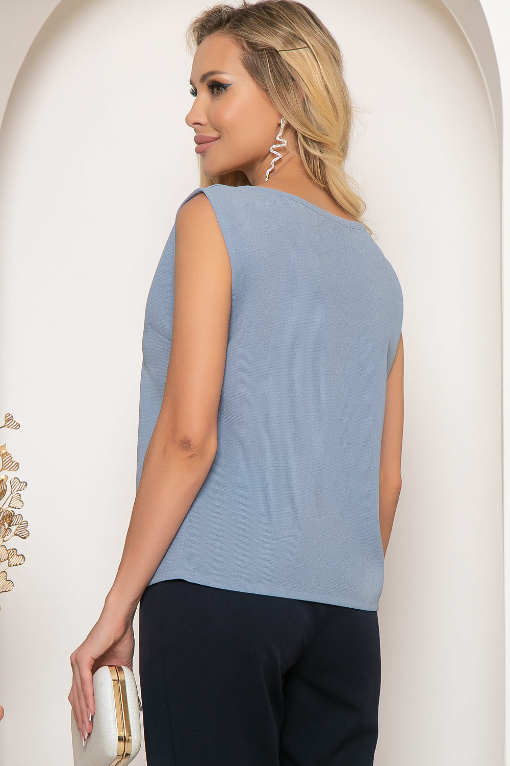Стильный топ свободного силуэта без рукава в красивом голубом оттенке идеально подойдёт для создания стильного офисного образа. Если добавить аксессуары, можно создать красивый вечерний образ. Топ свободного силуэта, без рукава. Классический округлый вырез горловины. Спинка немного удлинена. Идеальный пример "нижнего слоя" гардероба, удобно надевать под жакет.