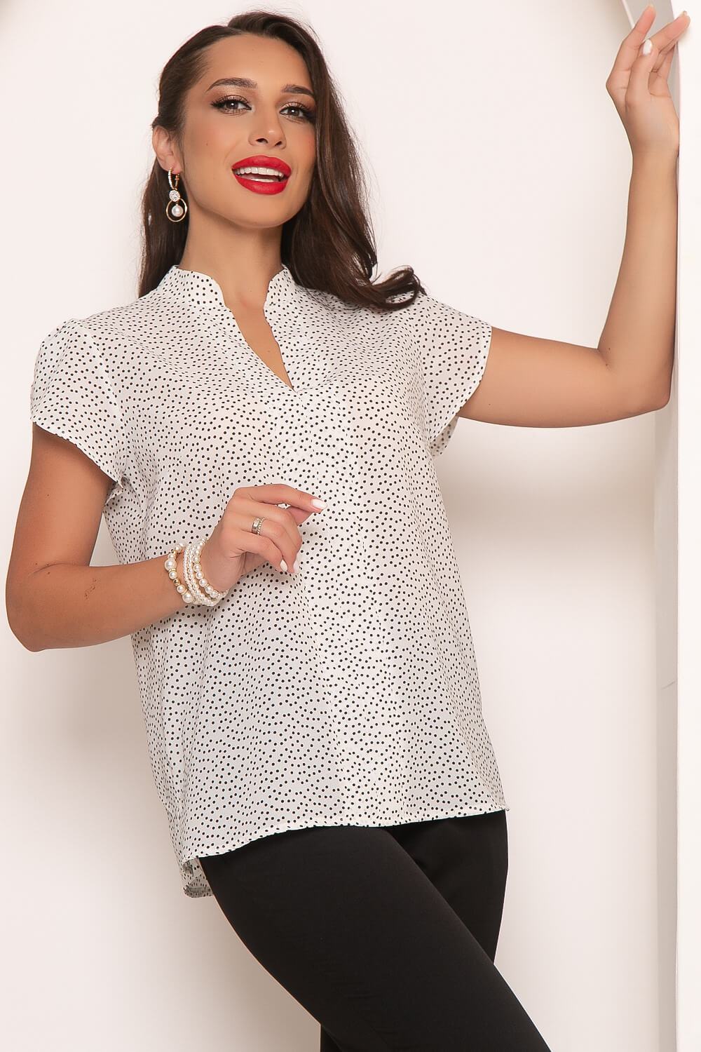 Классическая блуза в женственном исполнении - идеальный вариант для создания деловых образов. Украшением блузы является рукав, напоминающий по виду бутон цветка. Блуза прямого кроя, горловина оформлена стойкой. Рукав втачной, короткий. По боковым швам небольшие разрезы, низ ровный.