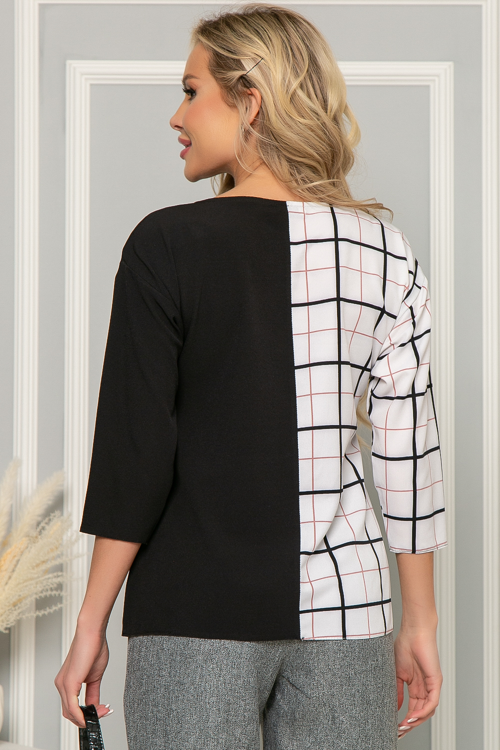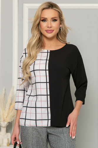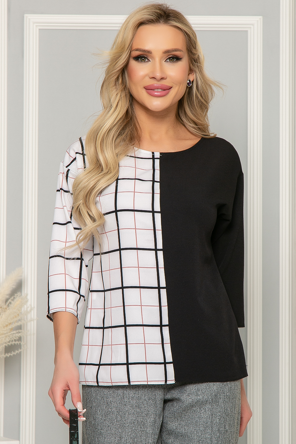 Вносим разнообразие в офисные образы! Блуза прямого кроя, состоящая из двух контрастных частей. Такую модель можно носить как навыпуск, так и под заправку и сочетать ёё с юбкой или брюками. Линия плеча блузы спущена, низ ровный.