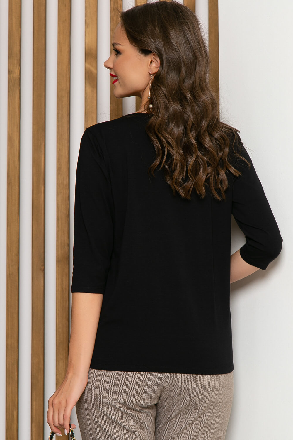 Джемпер из мягкого, приятного к телу трикотажа с акцентным вырезом, украшенным пришивными бусинами. Джемпер имеет полуприлегающий силуэт и комфортный рукав - три четверти. Удобен в качестве нижнего слоя под жакеты и кардиганы.