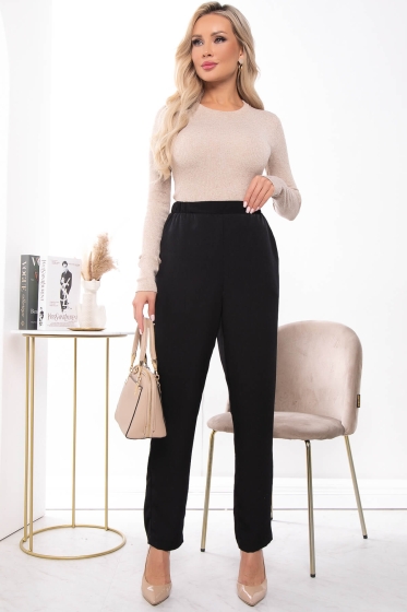 Классические брюки в классическом чёрном оттенке помогут Вам в создании изящных официальных образов. Брюки по талии оснащены резинкой, что позволяет добиться комфортной посадки по фигуре. В боковых швах есть карманы. Брюки подойдут для офисного и повседневного образа. Они не сковывают движений и выглядят стильно и лаконично, Вам останется только подобрать верх.
