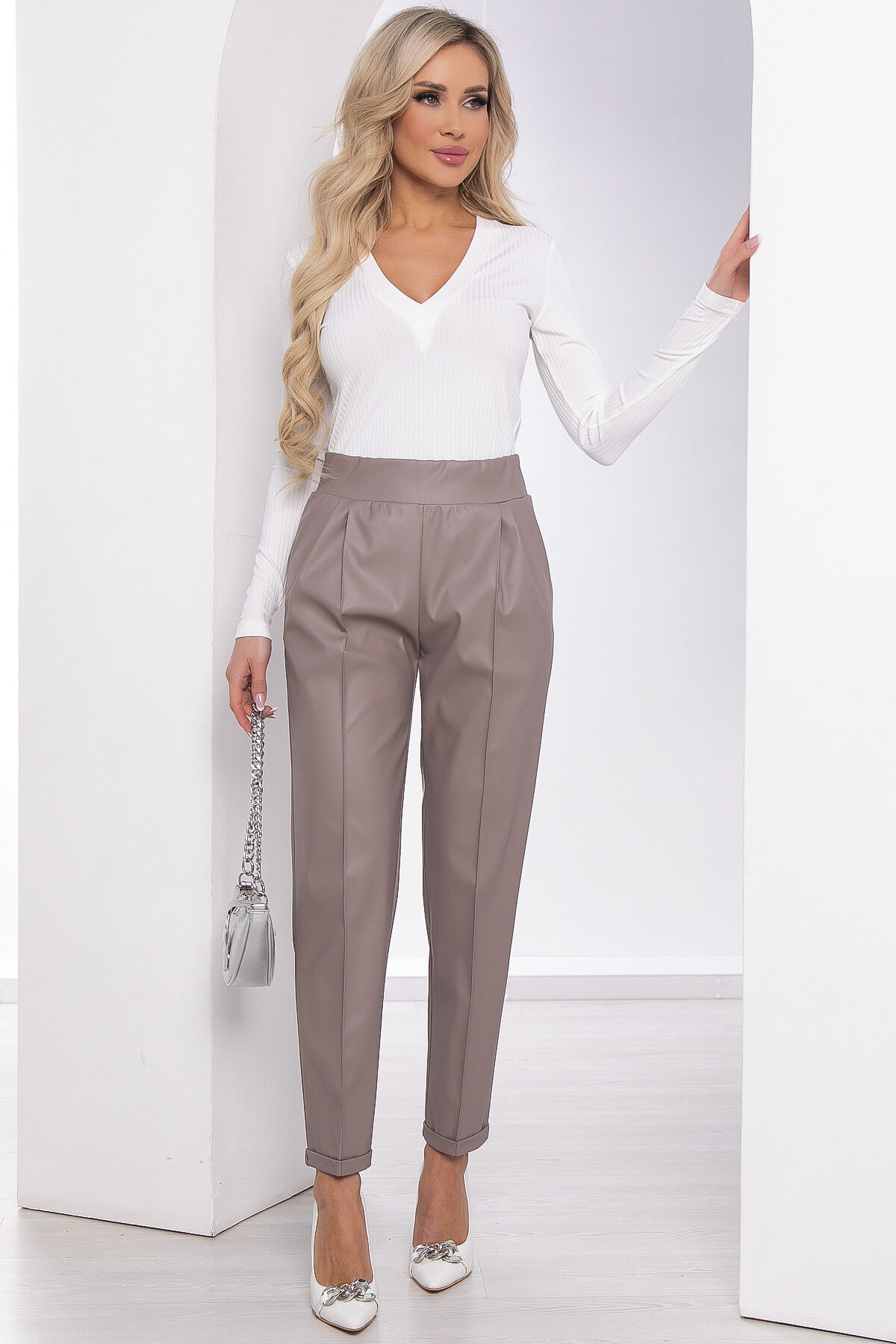 Брюки из экокожи зауженные бежевые Б8587