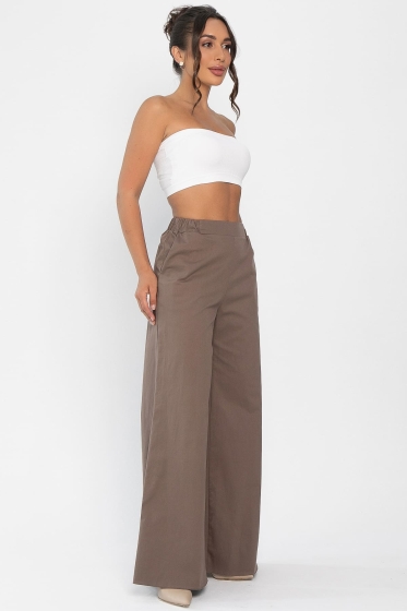 Брюки-палаццо для женщин в красивом оттенке кофе — это воплощение элегантности и стиля. Благодаря высокой талии и широким штанам, эти брюки создают изящный силуэт и визуально вытягивают ноги, делая фигуру более стройной. За счёт плетения нитей в ткани брюки имеют растяжение, что обеспечивает комфорт при носке. Это идеальный выбор для тех, кто хочет подчеркнуть свою женственность.