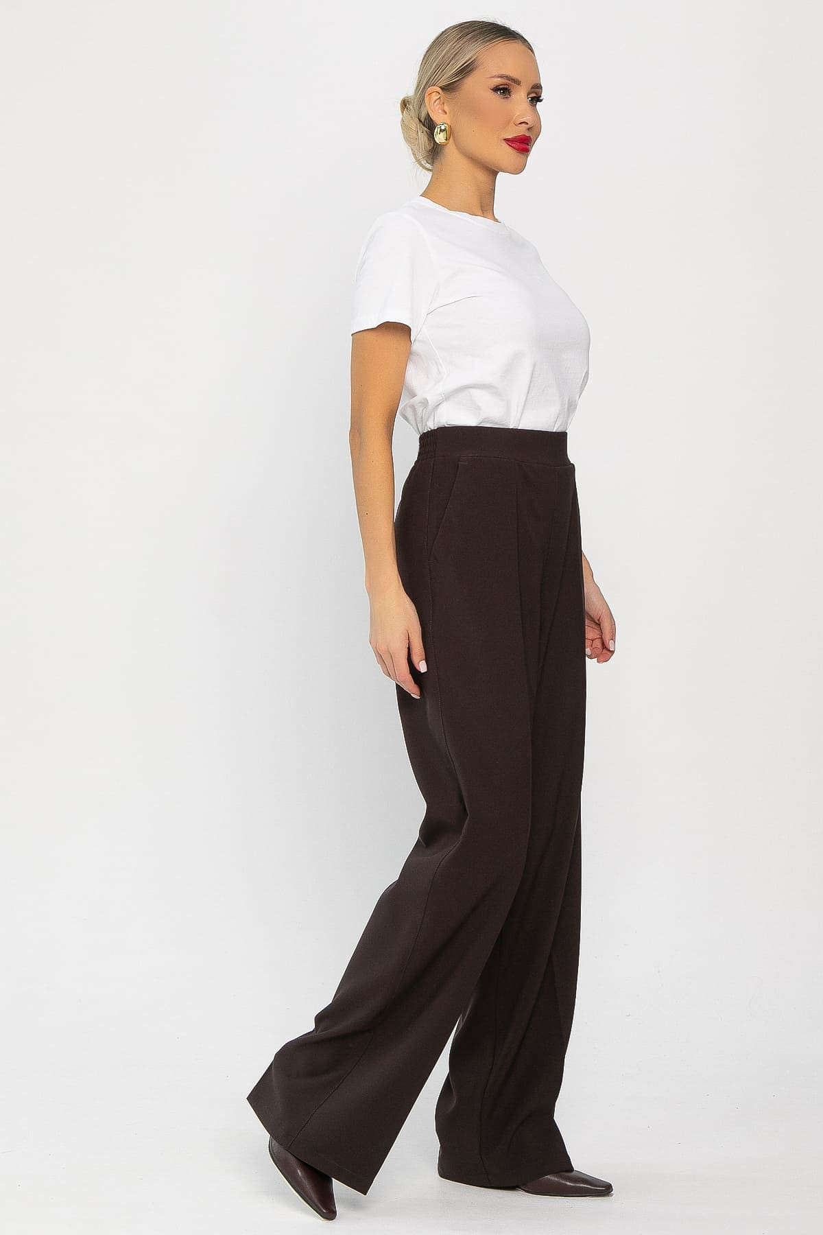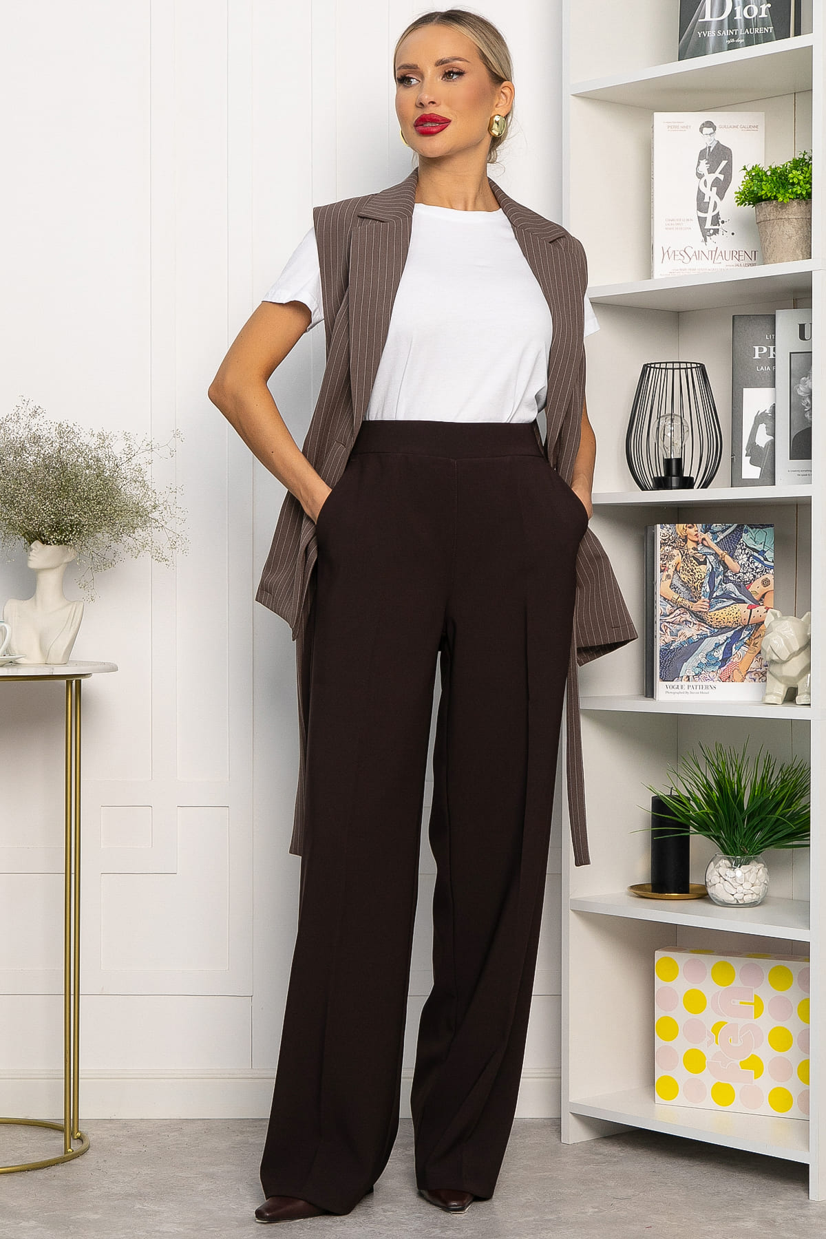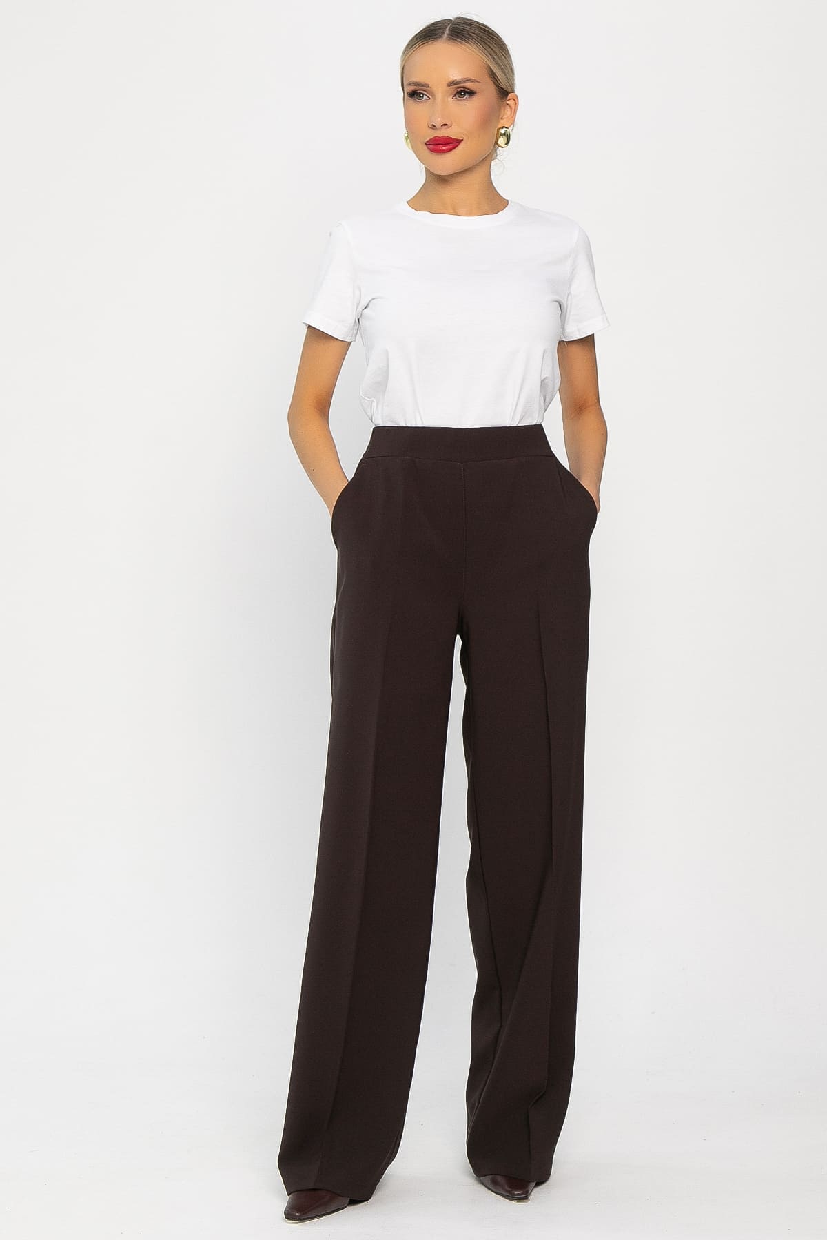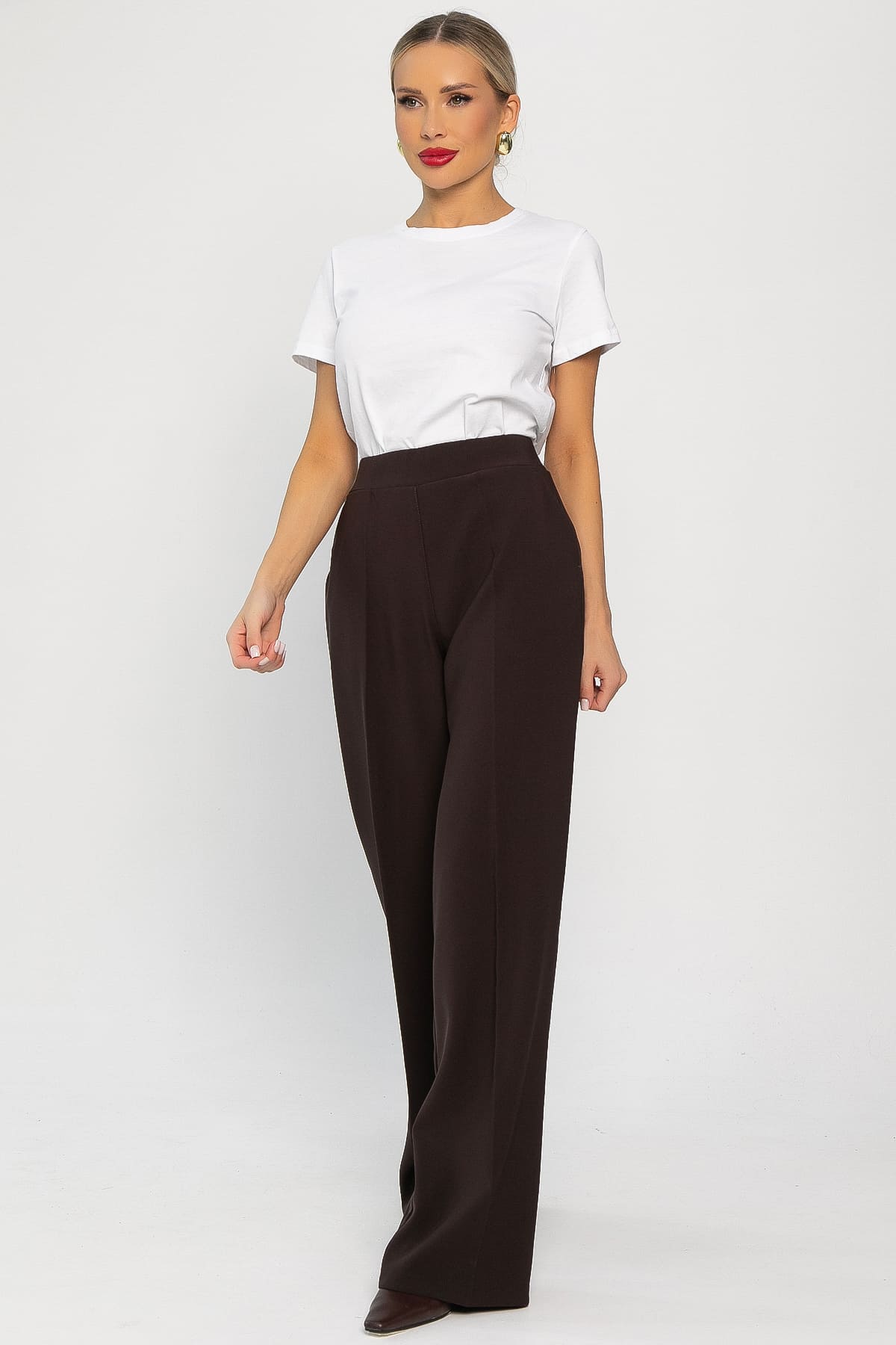 Стильные удлинённые брюки с высокой посадкой и прямым кроем в кофейном цвете — идеальный выбор для современного гардероба. Они отлично впишутся в повседневный гардероб и будут гармонично смотреться с футболками, рубашками, свитерами и кардиганами. Модель оснащена резинкой на талии и удобными карманами по бокам.
