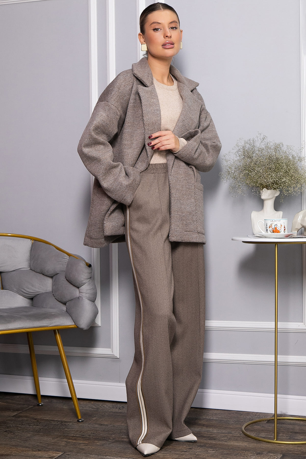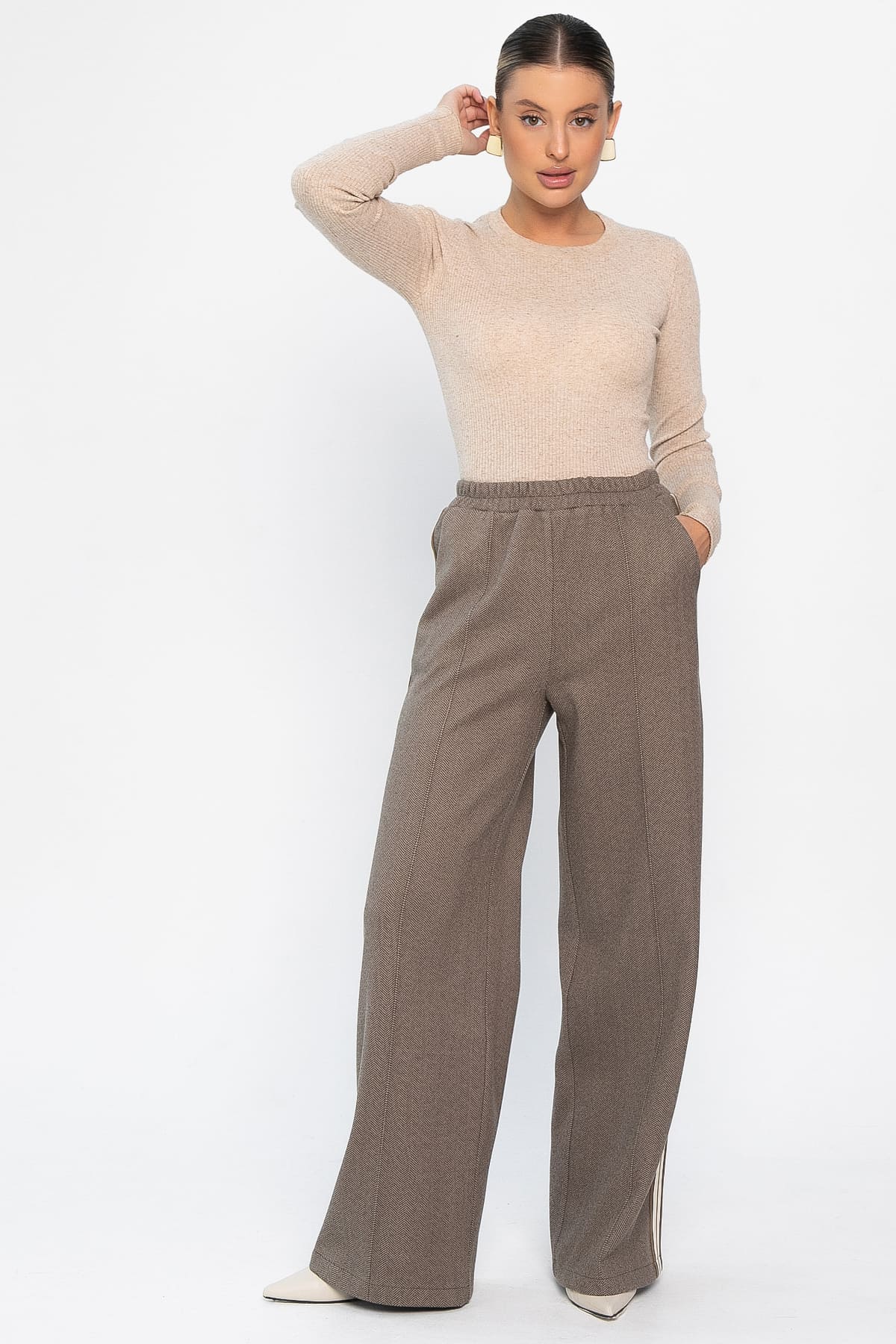 Стильные брюки палаццо с широкой свободной посадкой обеспечивают максимальный комфорт и элегантность. Эластичная резинка на поясе гарантирует удобную посадку, а практичные боковые карманы добавляют функциональности. По бокам брючин проходят контрастные лампасы, которые придают модели модный спортивный акцент и визуально удлиняют силуэт. Идеальный выбор для создания стильных и комфортных образов на каждый день.