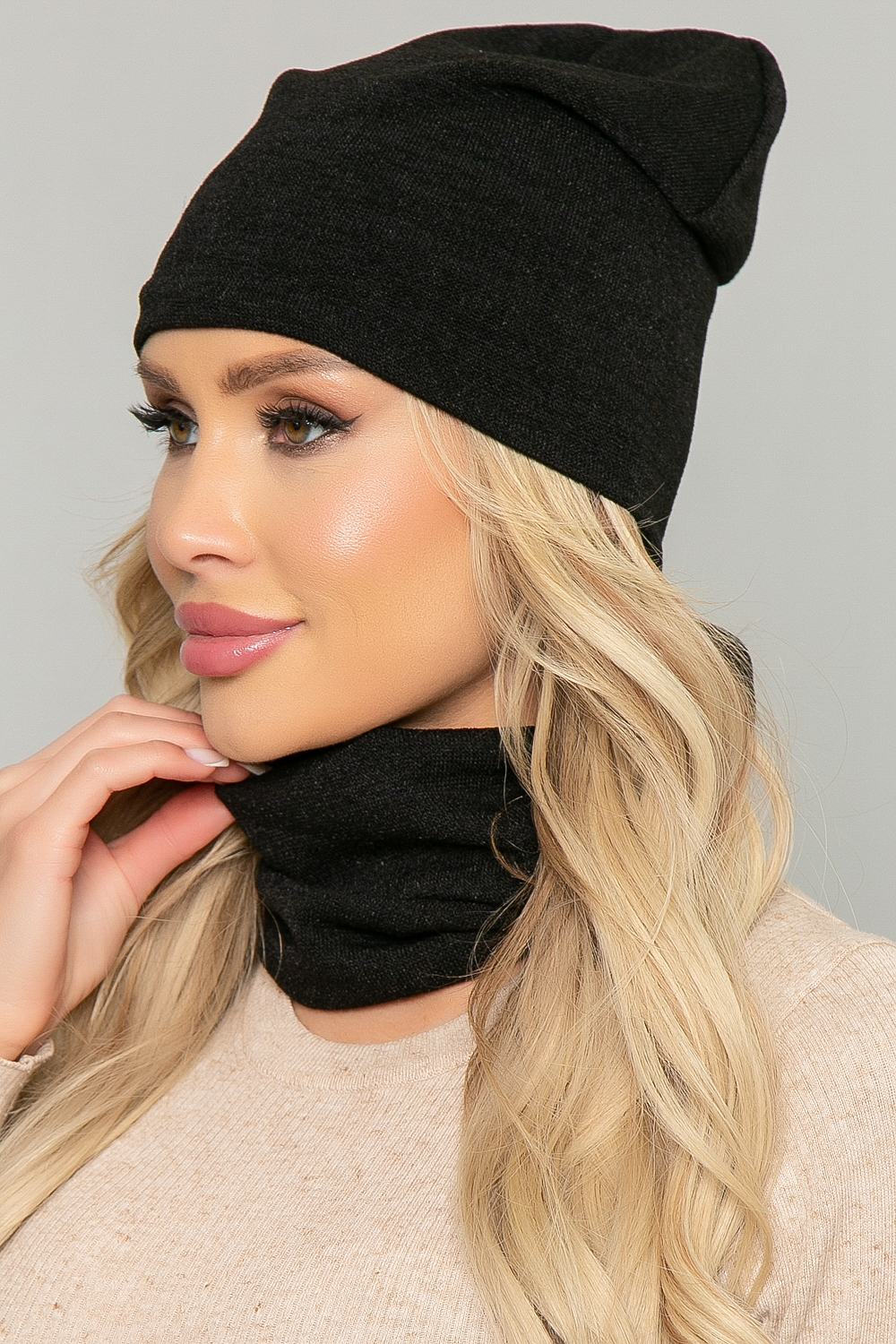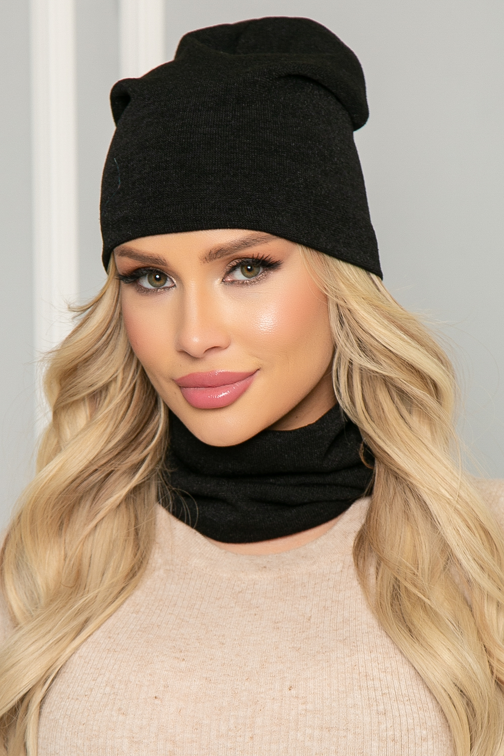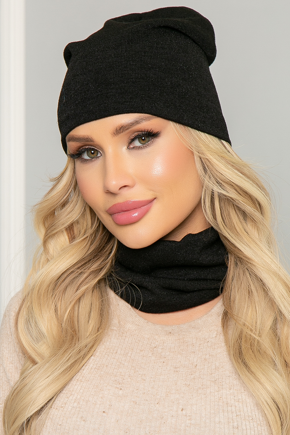Стильный трикотажный комплект в классическом чёрном цвете. Шапка имеет универсальную форму и подходит для любой формы лица. Можно носить с отгибкой и без. Однослойный снуд позволит защитить шею от ветра.