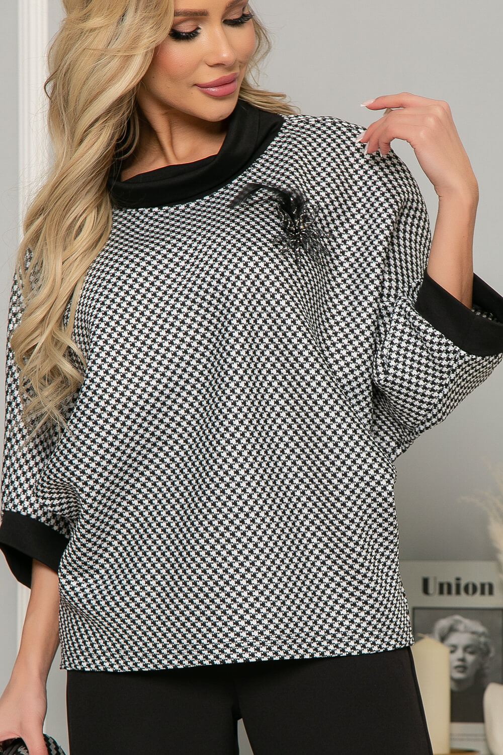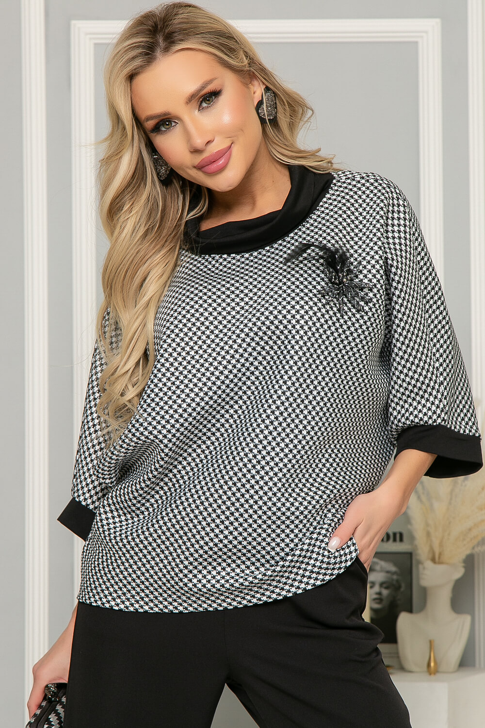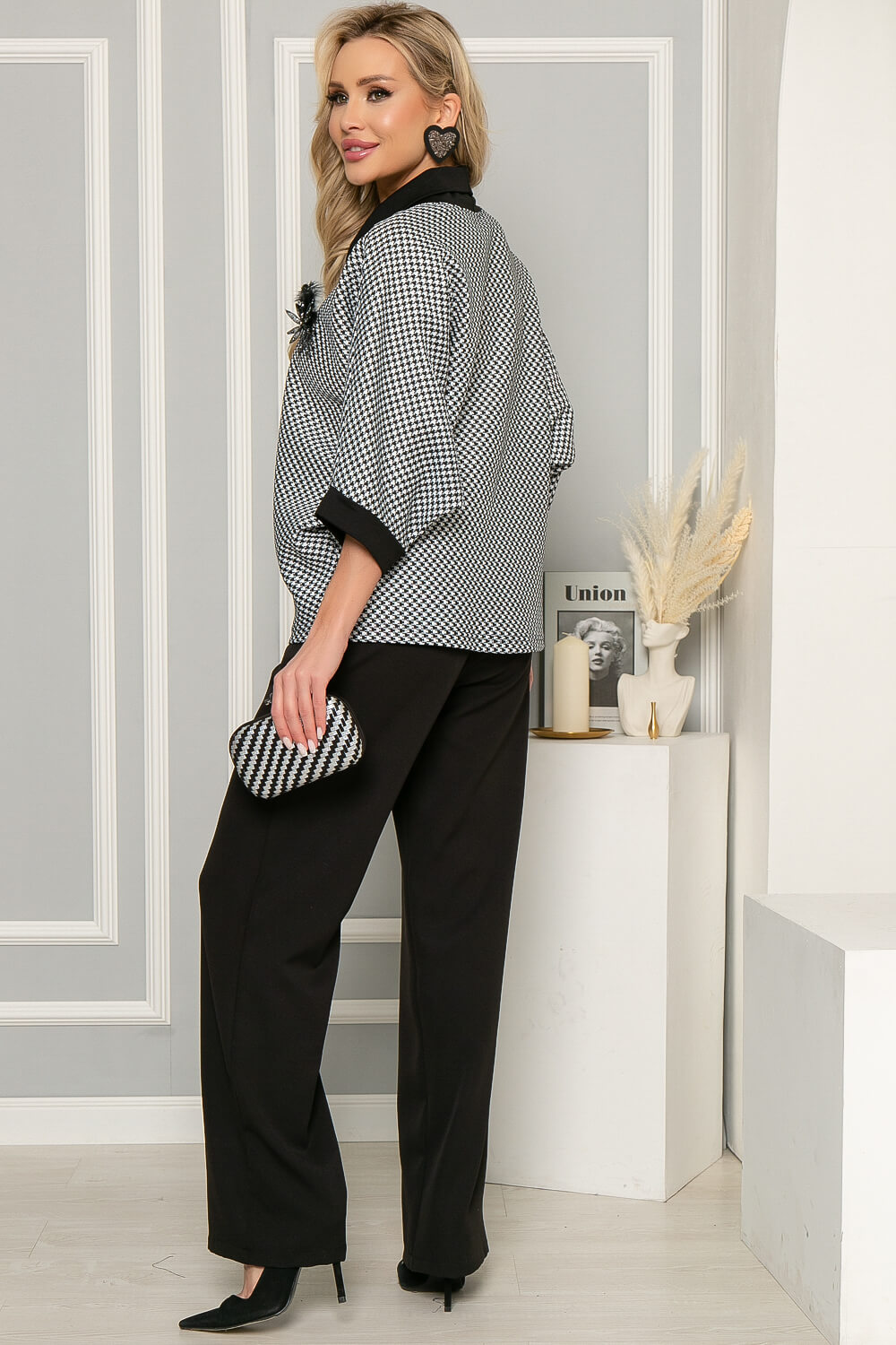 Костюм-двойка, состоящий из классических брюк прямого кроя и джемпера свободного кроя. Преимущество комплекта в том, что Вы сможете самостоятельно носить как жакет, так и брюки. В повседневном образе смело сочетайте с лоферами или ботинками, а если нужен более официальный образ - то с туфлями на каблуке. Костюм выполнен из плотной костюмной ткани. Акцентом данной модели является пройма рукава - "Летучая мышь". В комплект входит брошь.
