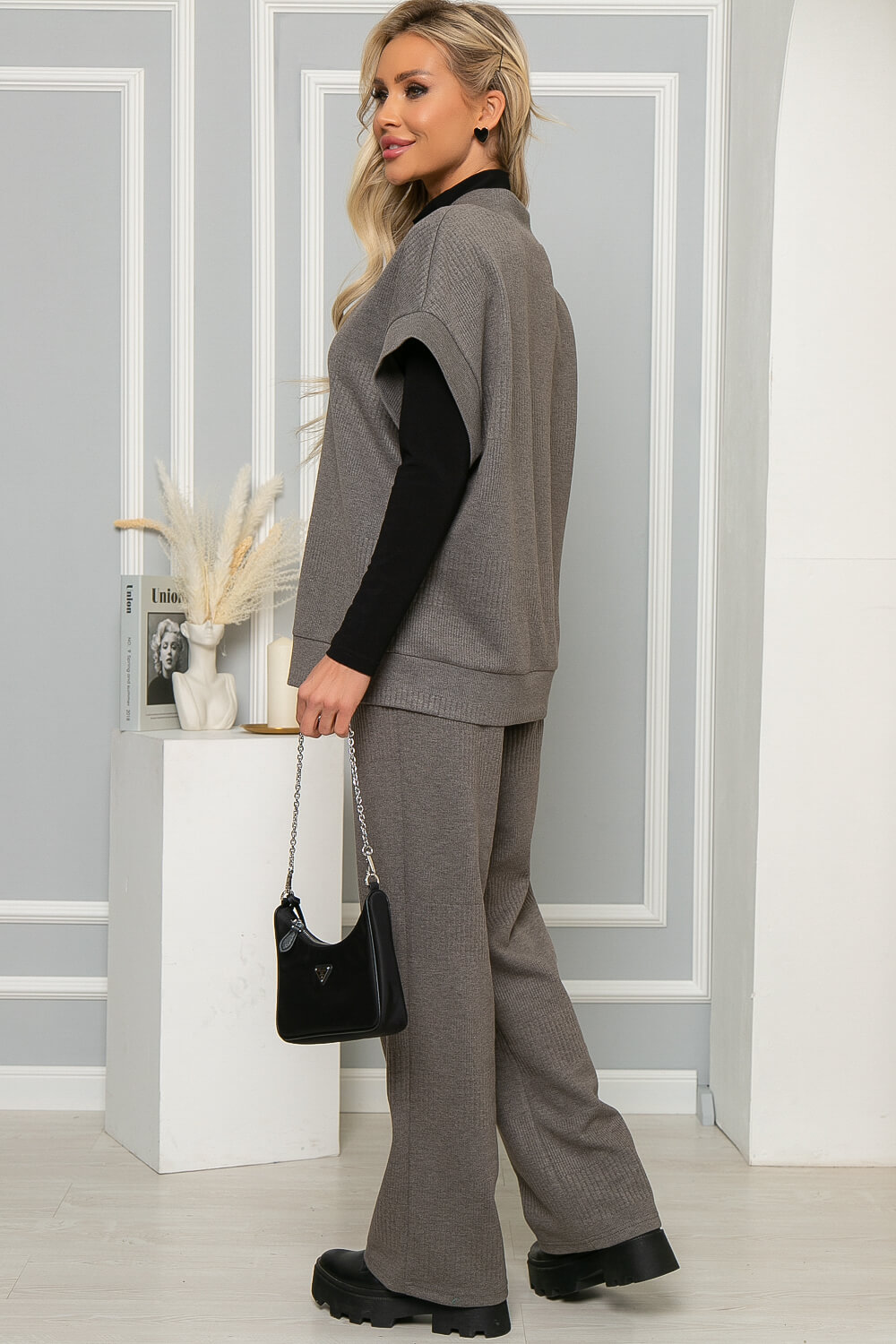 Костюм-двойка, состоящий из прямых брюк с высокой посадкой на резинке и жилета свободного кроя. Преимущество комплекта в том, что вы сможете самостоятельно носить как жакет, так и брюки. В повседневном образе смело сочетайте с лоферами или ботинками, а если нужен более официальный образ, с туфлями на каблуке.