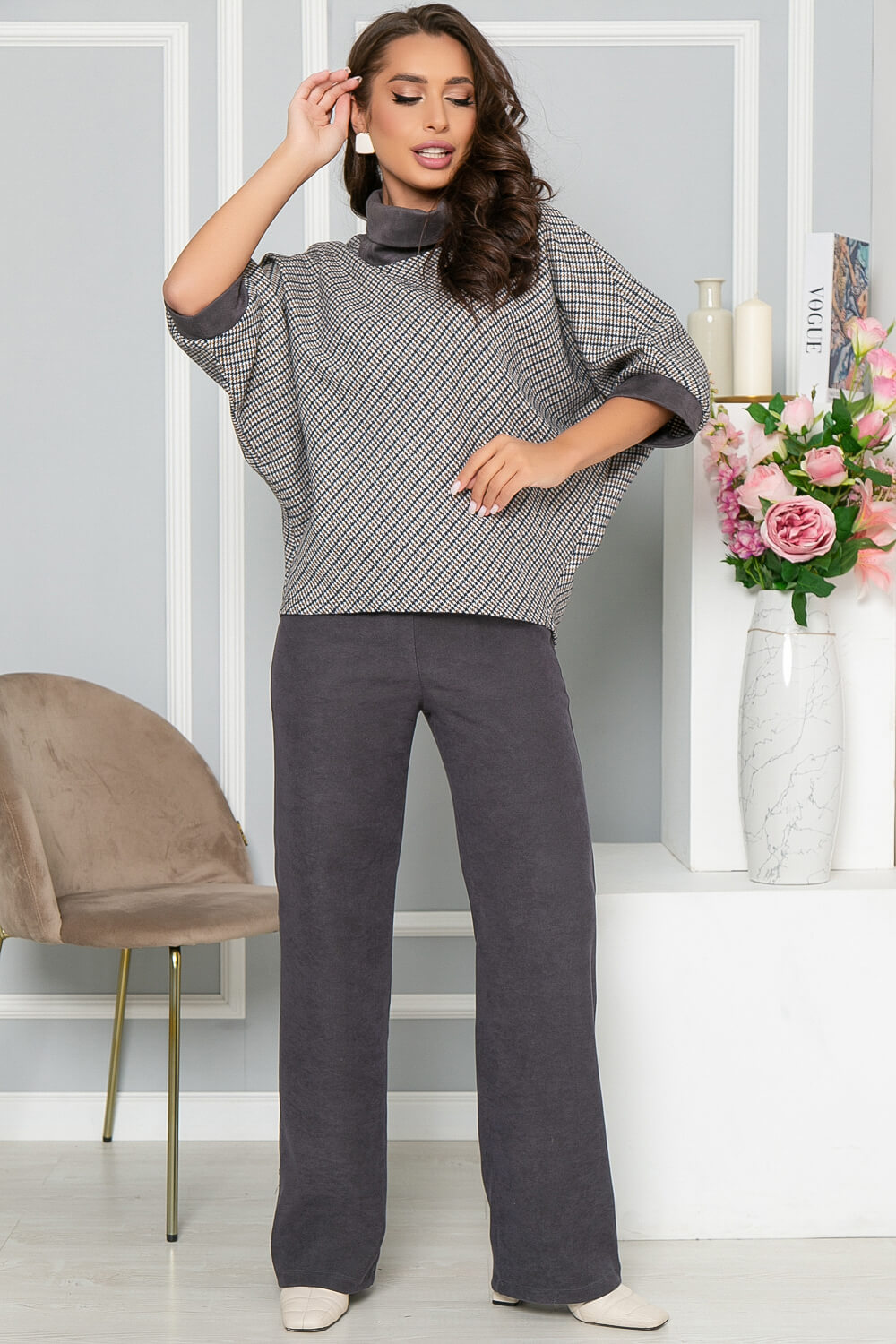 Костюм-двойка, состоящий из классических брюк прямого кроя и джемпера свободного кроя. Преимущество комплекта в том, что Вы сможете самостоятельно носить как джемпер, так и брюки. В повседневном образе смело сочетайте с лоферами или ботинками, а если нужен более официальный образ - то с туфлями на каблуке. Костюм выполнен из плотной костюмной ткани. Акцентом данной модели является пройма рукава - "Летучая мышь".