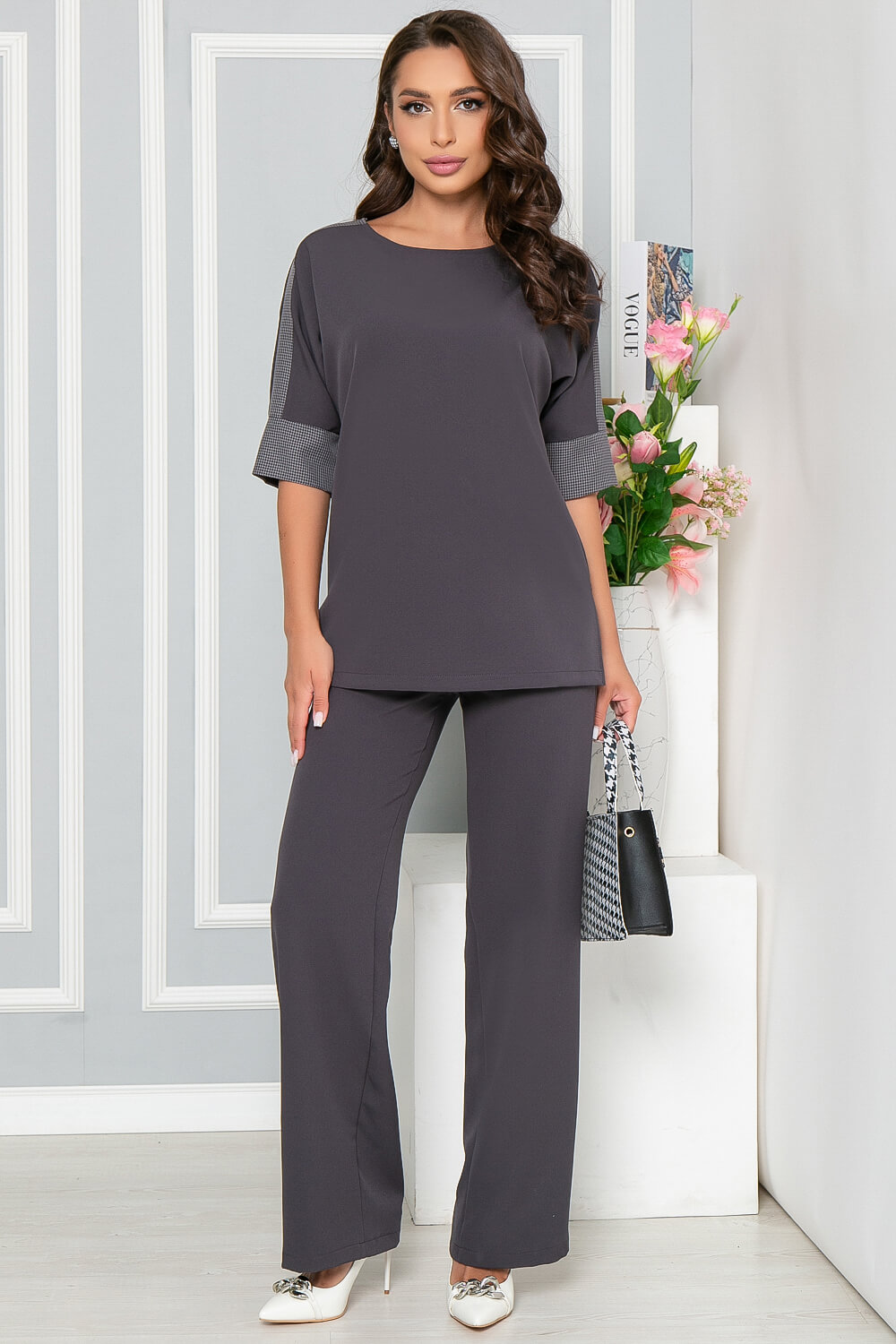 Костюм-двойка, состоящий из классических брюк прямого кроя и блузы прямого кроя кроя. Данный комплект можно носить, подчеркнув талию поясом из основной ткани или же, заправив блузу. В обоих вариантах костюм будет смотреться интересно. Брюки по талии на резинке, в боковых швах есть карманы. Блуза прямого кроя, по бокам есть разрезы. Пояс из основной ткани входит в комплект.