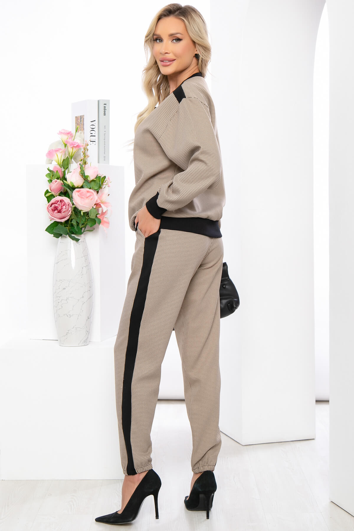 Костюм-двойка, состоящий из брюк с высокой посадкой на резинке и свитшота. Костюм в стиле смарт-кэжуал станет верным спутником на каждый день. Его можно сочетать с грубыми ботинками, лоферами, кроссовками и даже туфлями-лодочками. Преимущество комплекта в том, что Вы сможете самостоятельно носить как свитшот, так и брюки.