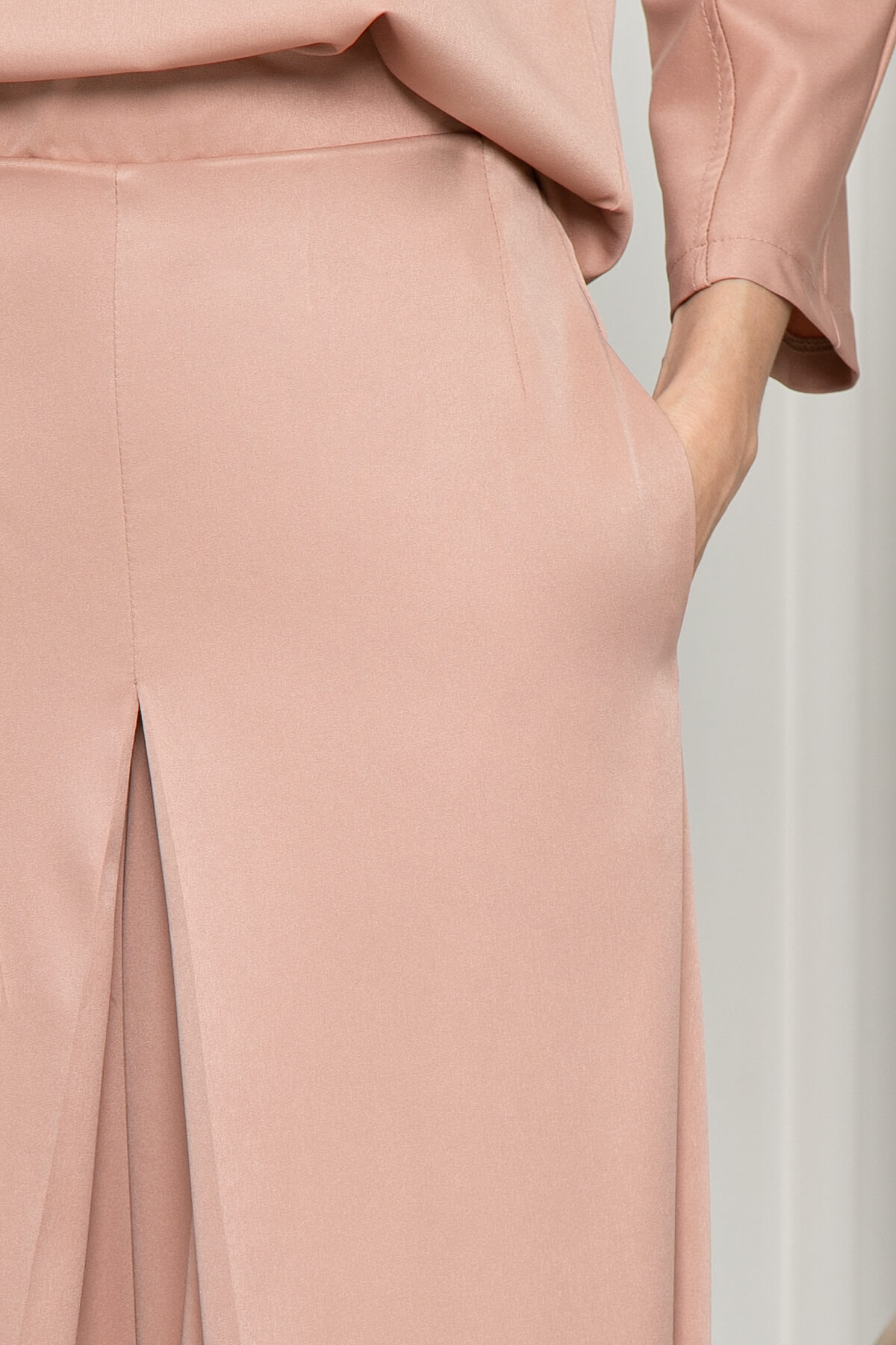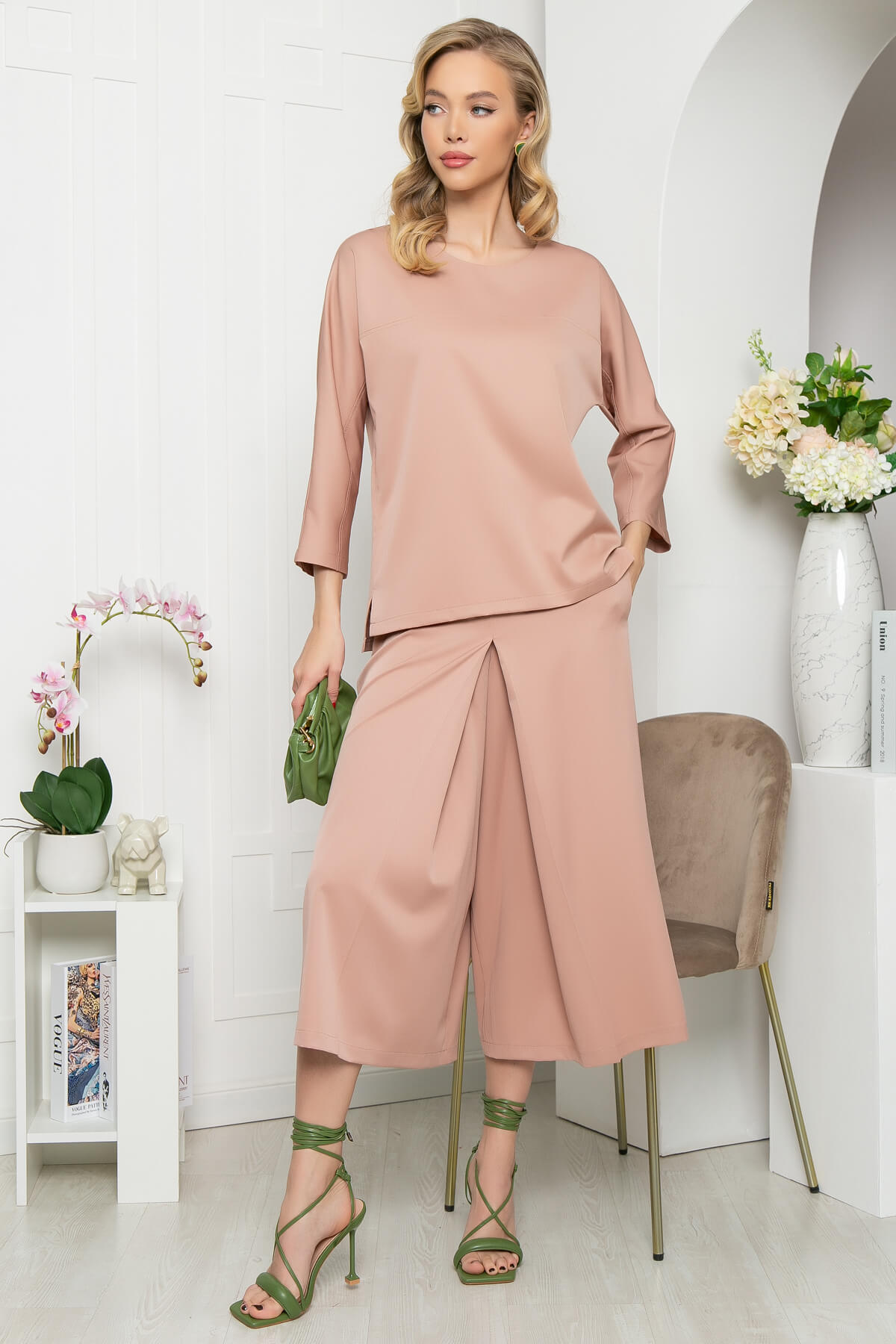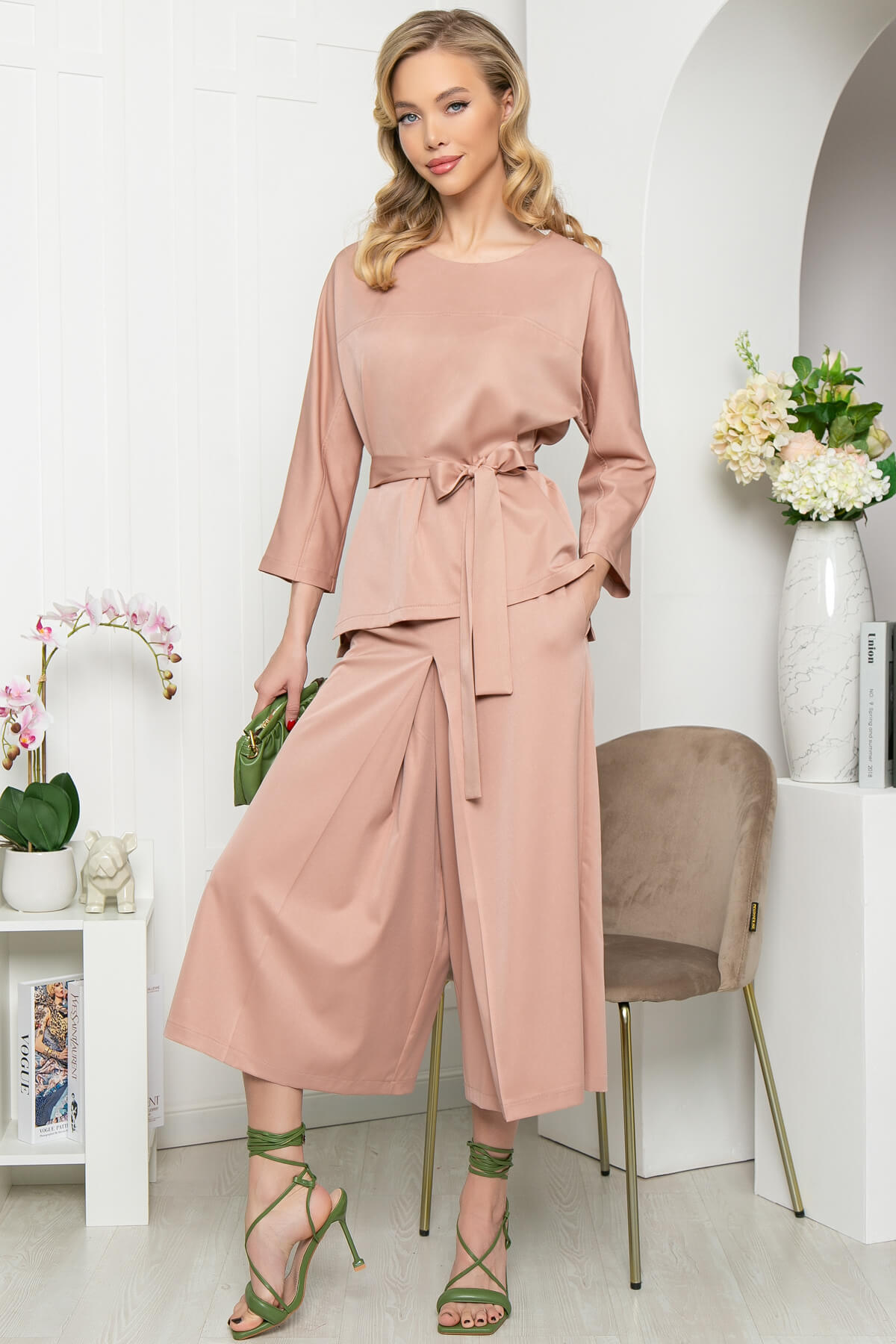 Костюм из лёгкой костюмной ткани в красивом пудровом оттенке подойдёт для создания повседневного или стильного делового образа. Отдельного внимания заслуживает нижняя часть костюма. Юбка-шорты - эффектная альтернатива брюкам. Свободный крой не сковывает движений и дарит комфорт. В комплект входит пояс из основной ткани.