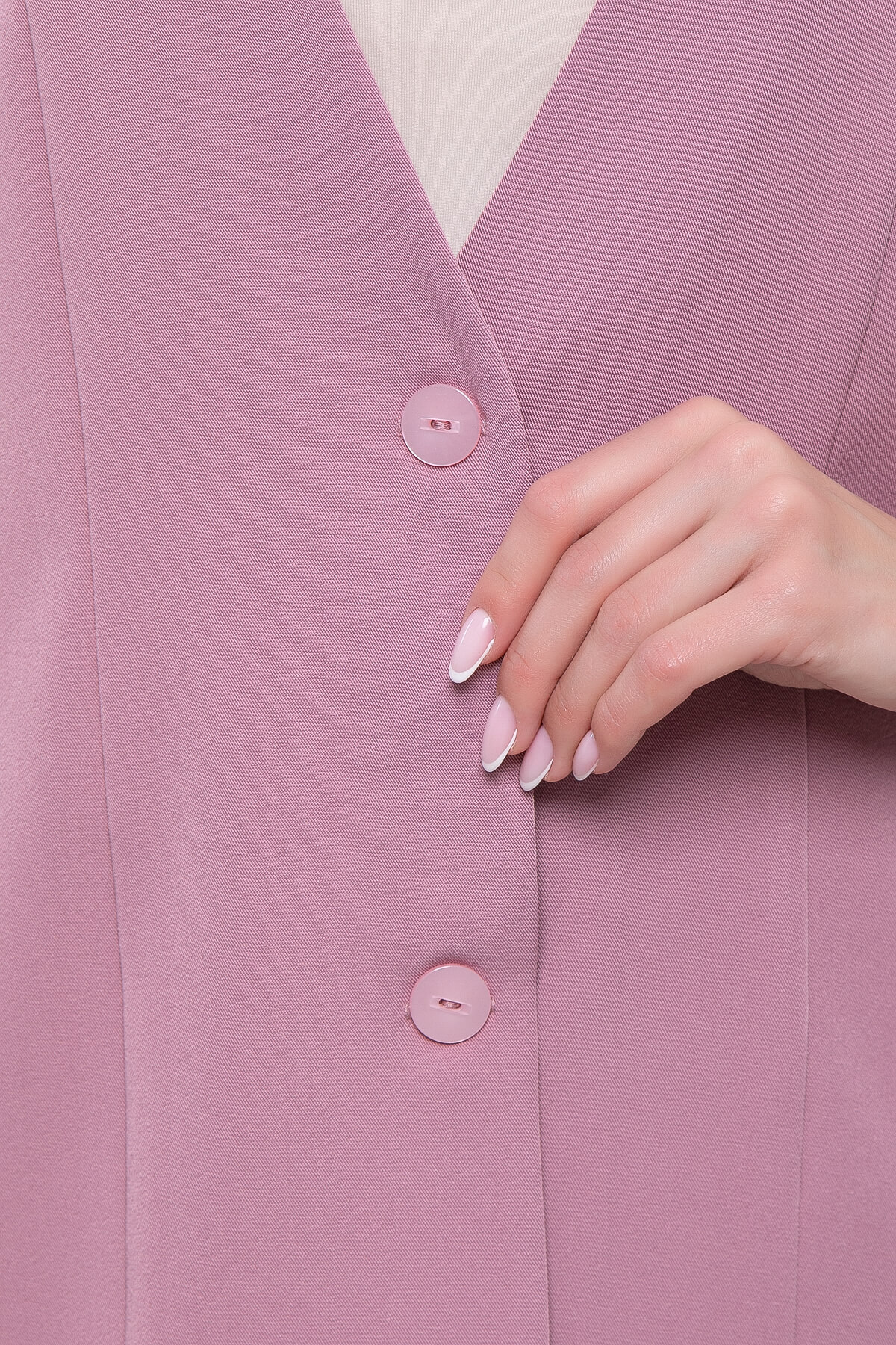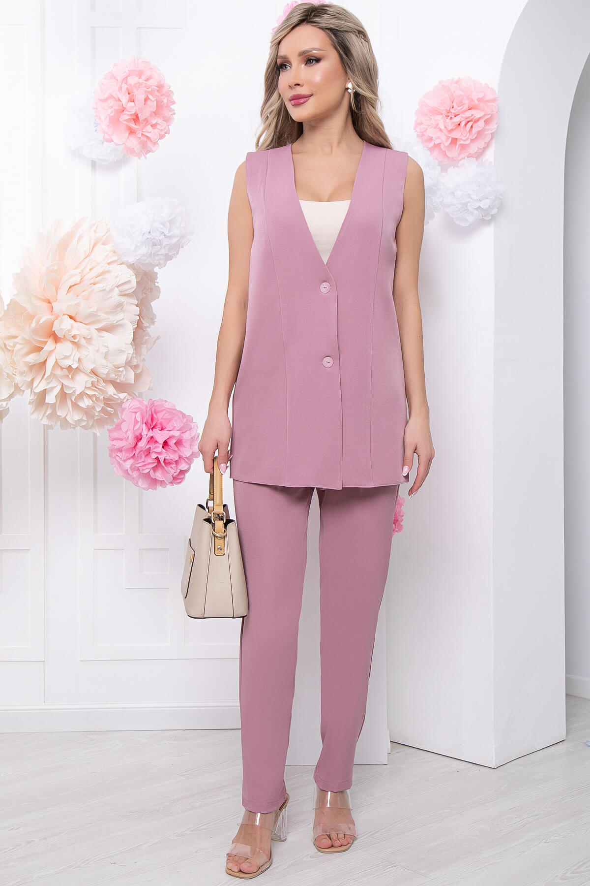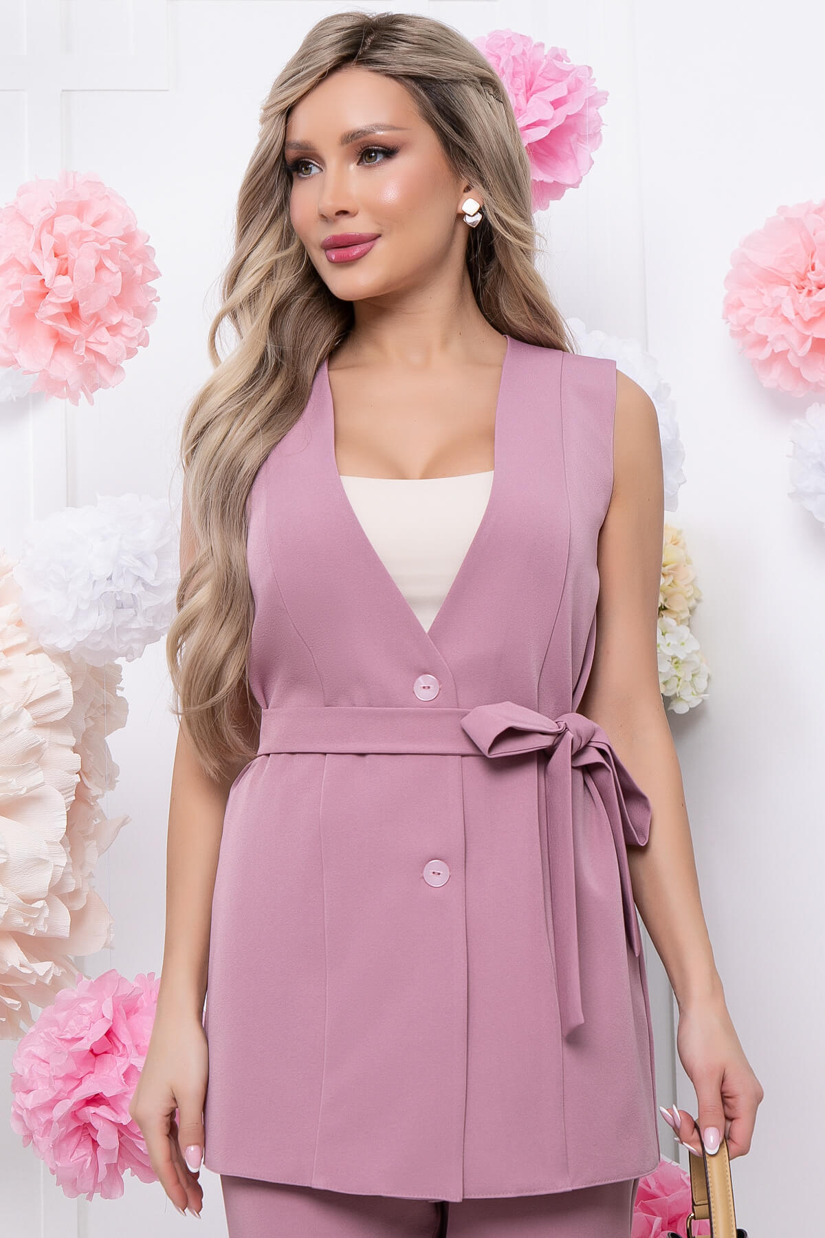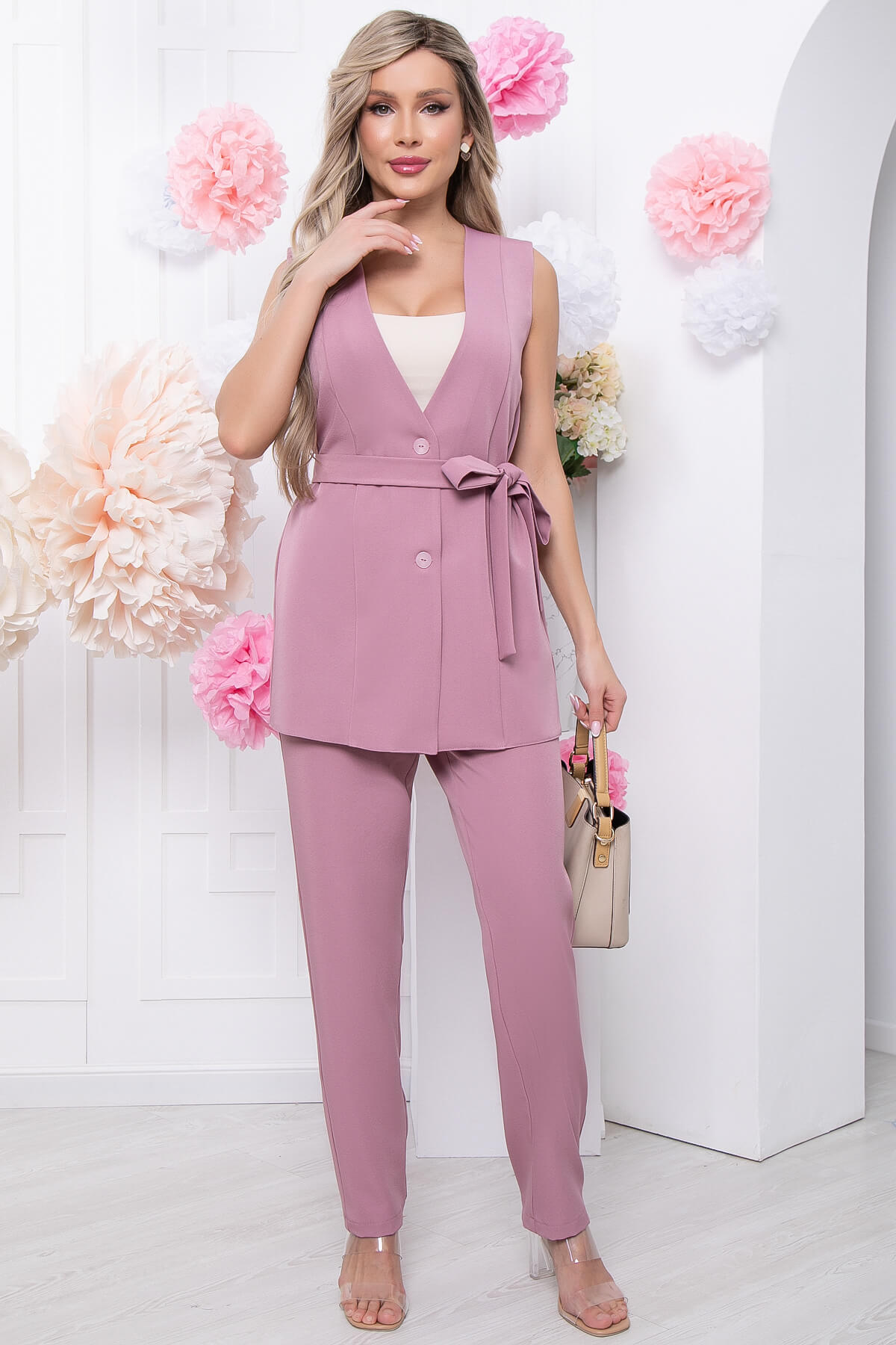 Элегантный костюм, состоящий из брюк и жилета, идеально будет смотреться, как в повседневной жизни, так и на деловой встрече. Жилет можно дополнить поясом из основной ткани, который идет в комплекте. С поясом образ получится более утонченным. Жилет без подкладки и без карманов. Брюки классические, по талии на резинке.